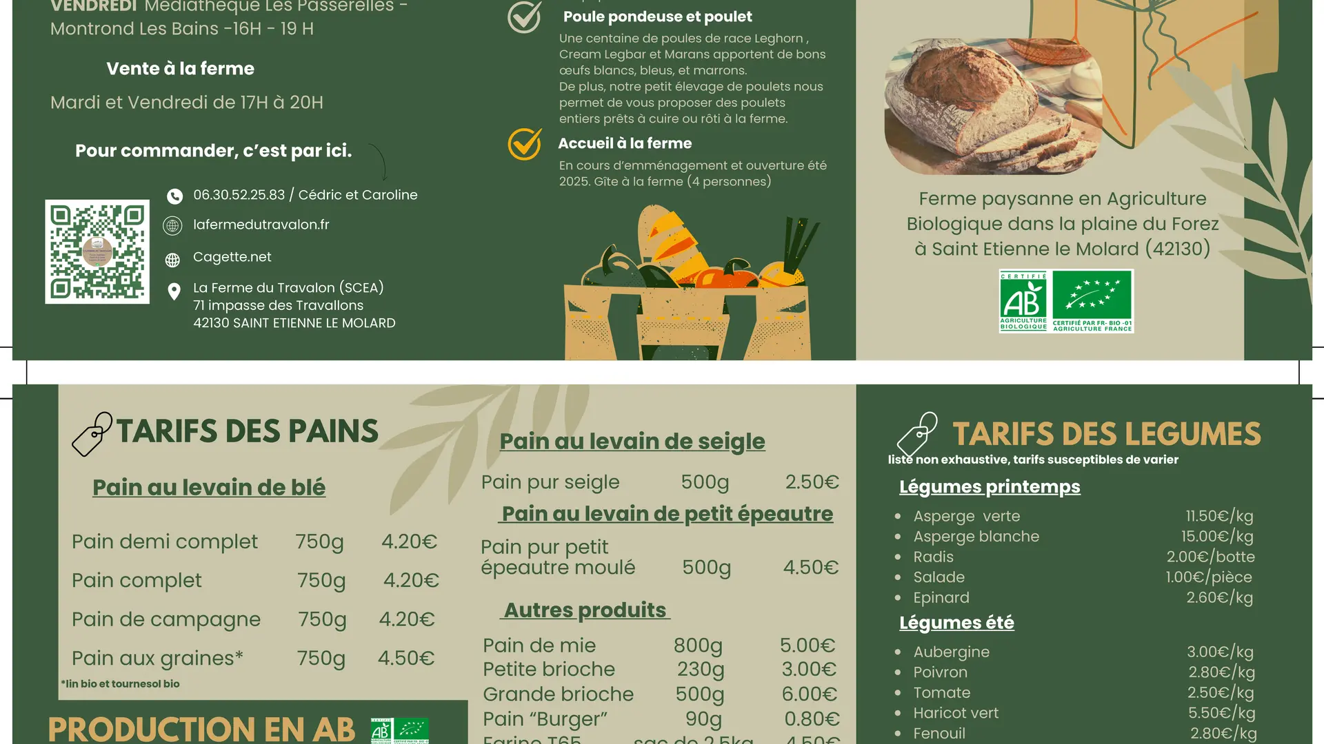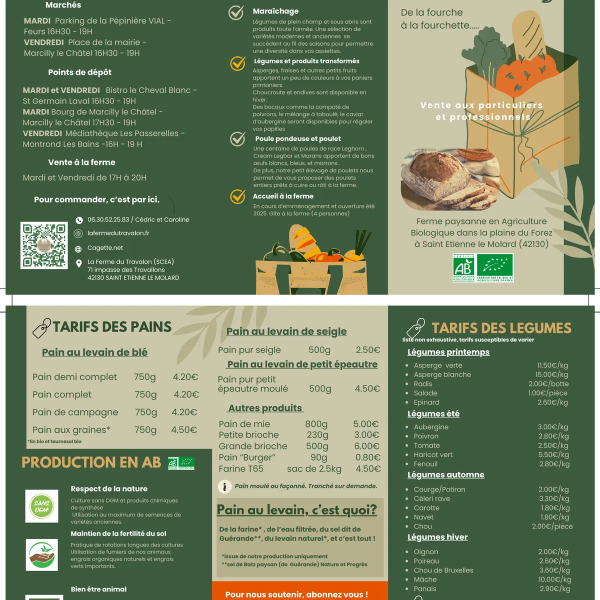 Paysans-boulangers et maraîchers, nous proposons des pains purs levains naturel avec la farine faite à la ferme sur moulin à meule de pierre de type Astrie et des légumes de saison en vrac ou panier. Nous proposons aussi des œufs et poulets prêt à cuire.