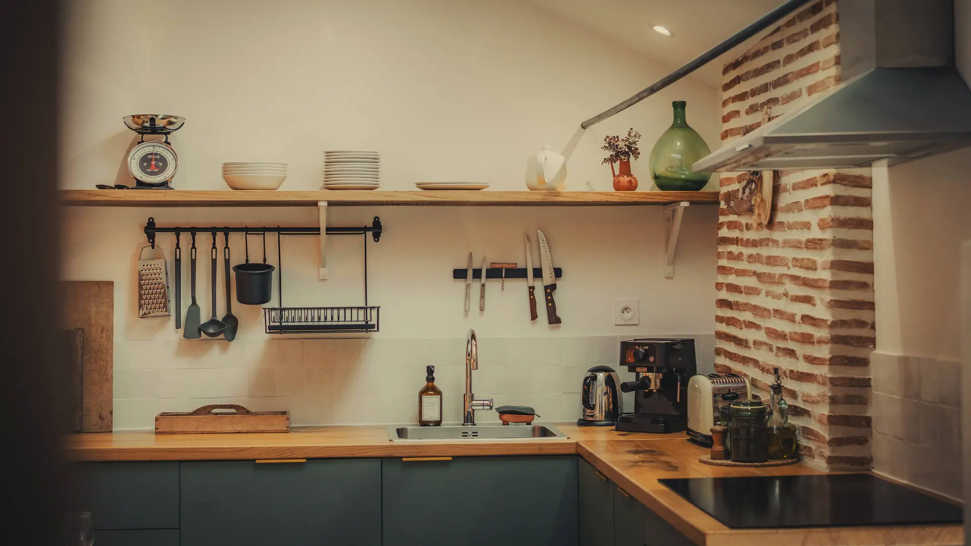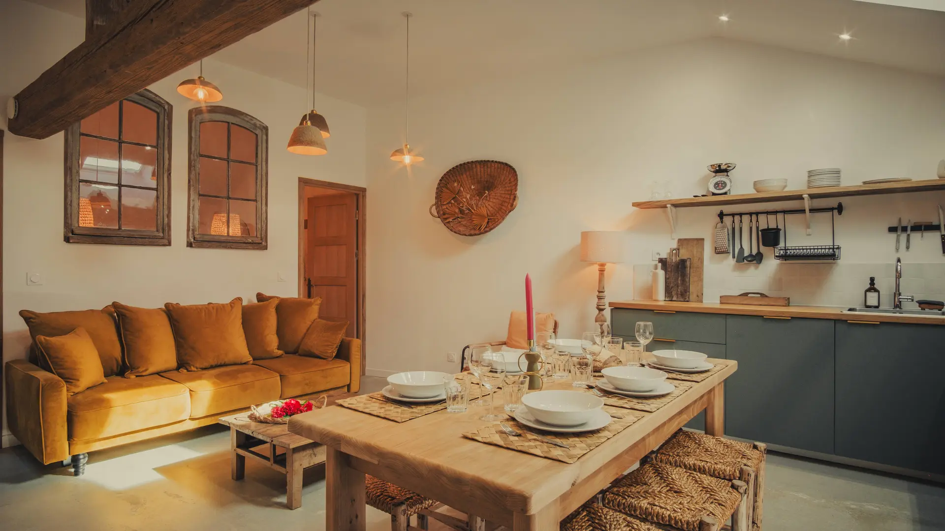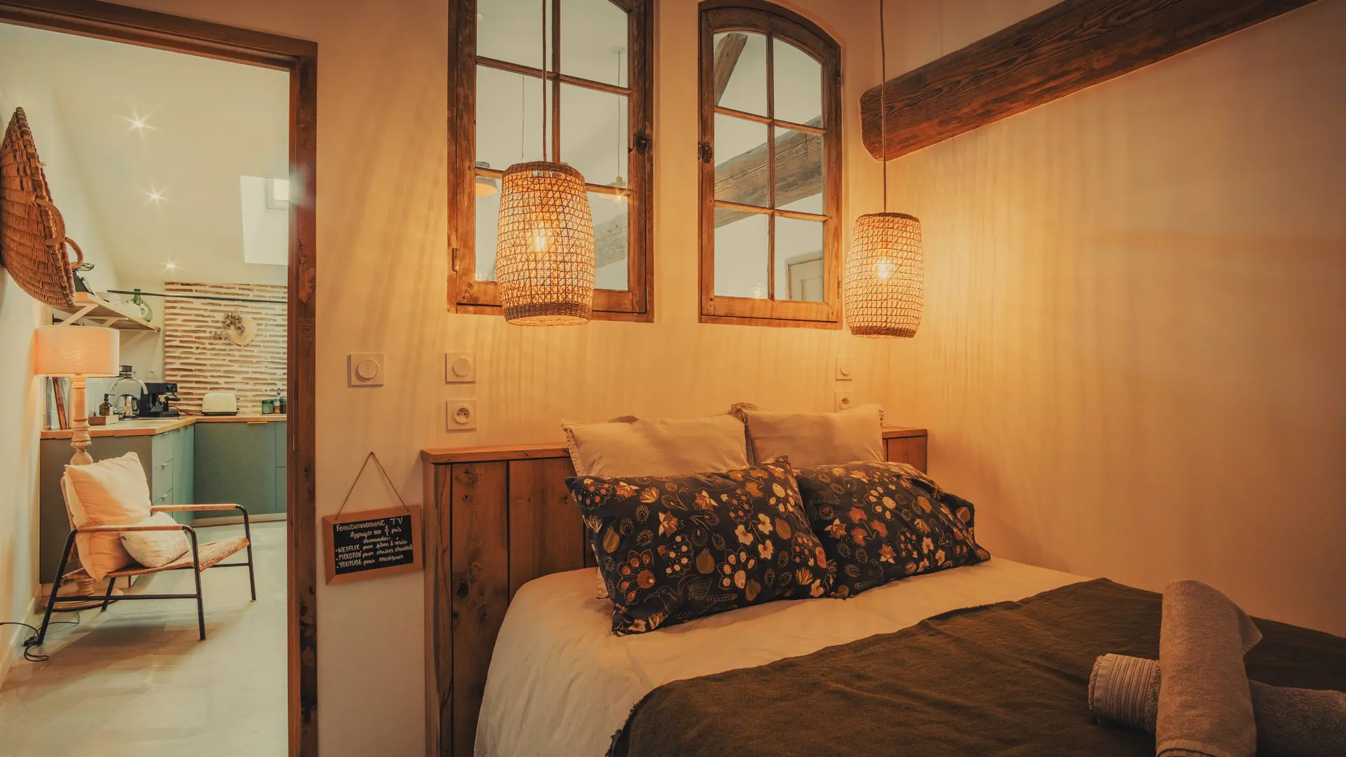 Nous avons œuvré dans le respect de l'existant en conservant un maximum d'éléments d'époque (poutres, briquettes) tout en améliorant au maximum le confort de vie de l'hébergement (isolation, chauffage, ameublement de qualité, cuisine, etc...).