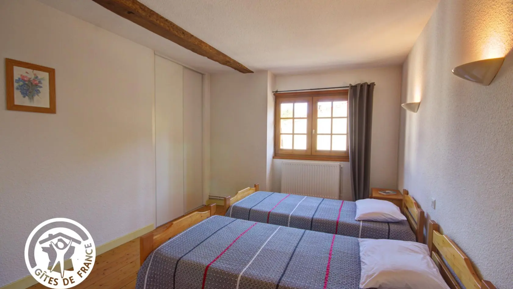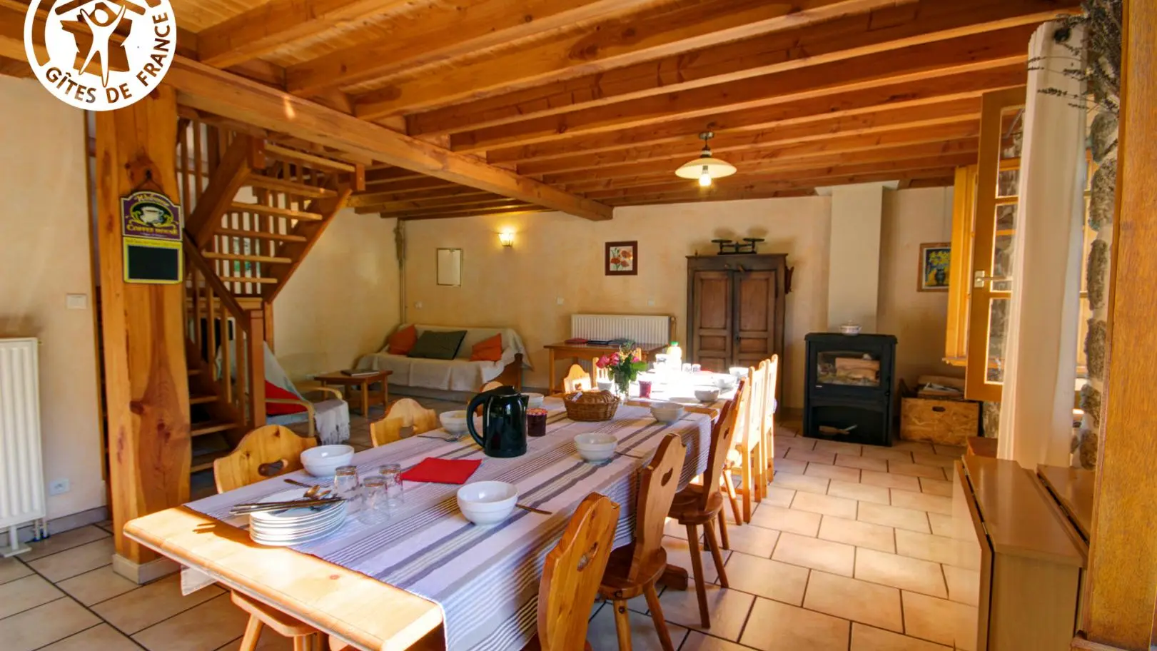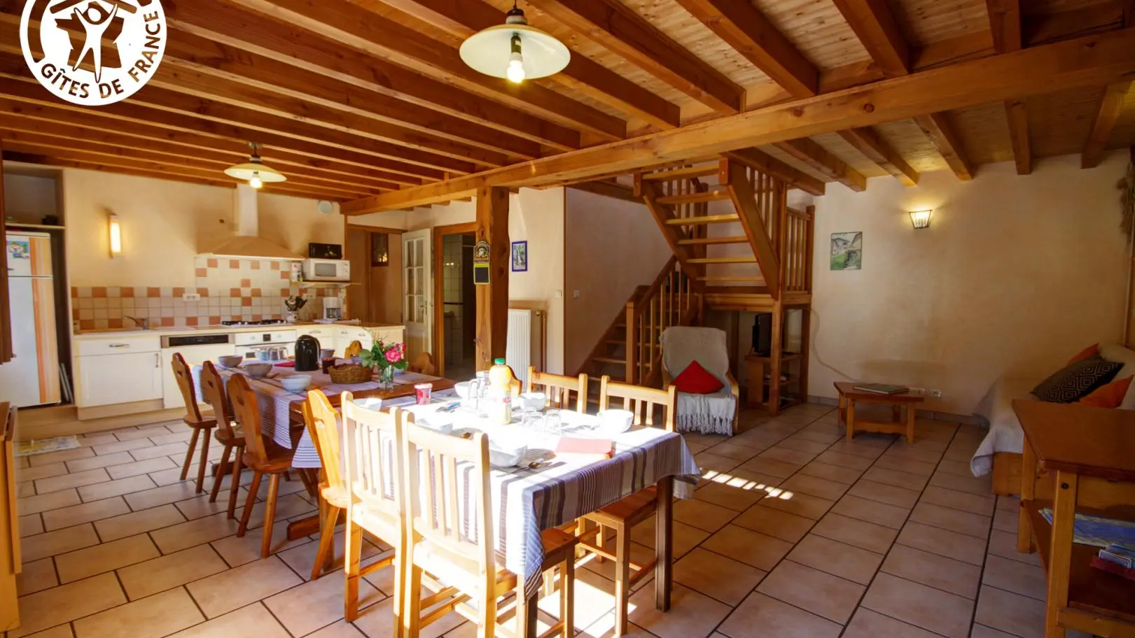 Gîtes regroupables permettant d'accueillir 12 personnes dans deux espaces communiquant (vous pouvez passer d'un gîte à l'autre sans sortir). Un 1er gîte "La Tour" de 130² sur rez-de-chaussée + étage, grande salle de séjour (permettant de recevoir 12 à 15 personnes pour les repas) et coin salon, poêle à bois, cuisine, 3 chambres dont la chambre des parents spacieuse, située dans une partie arrondie de la maison ce qui lui donne beaucoup de cachet. Et un 2ème gîte "Le Camarin" de 120 m² sur rez-de-chaussée surélevé + étage, coin-cuisine, grande salle de séjour, coin salon, poêle à bois (bois fournis), 3 chambres mansardées, coin jeux en mezzanine. Intérieur du gîte particulièrement chaud, belles poutres, murs en pierres. Gîte orienté sud-est, garantissant très bon ensoleillement.