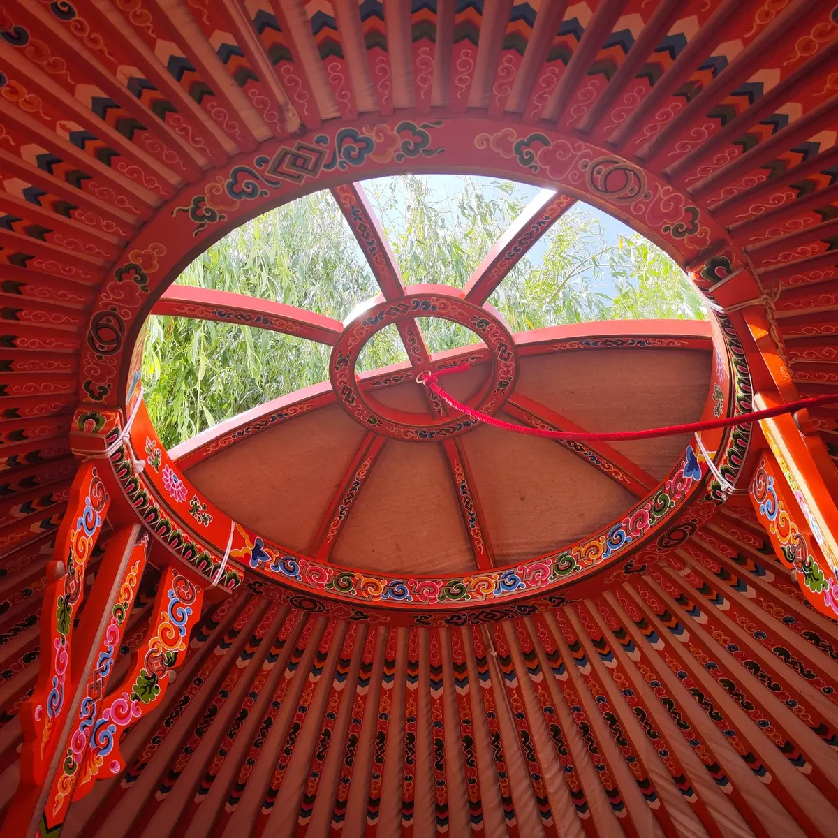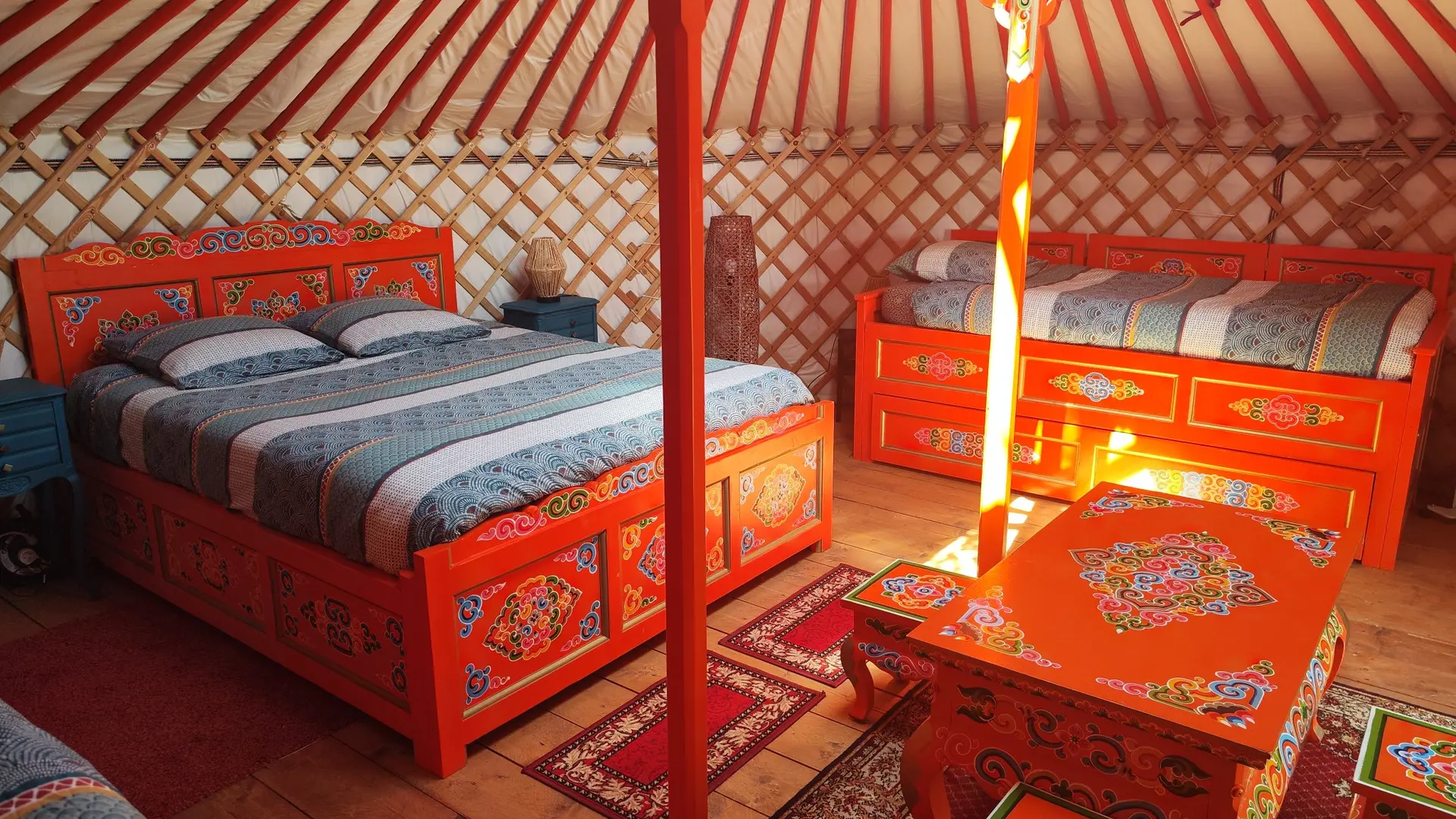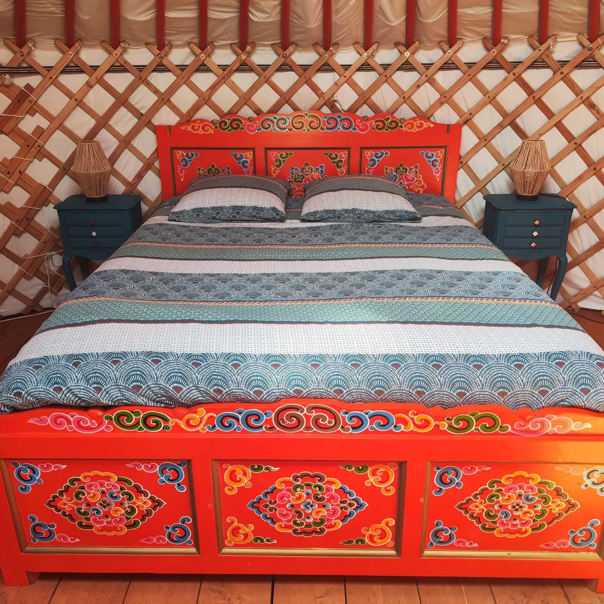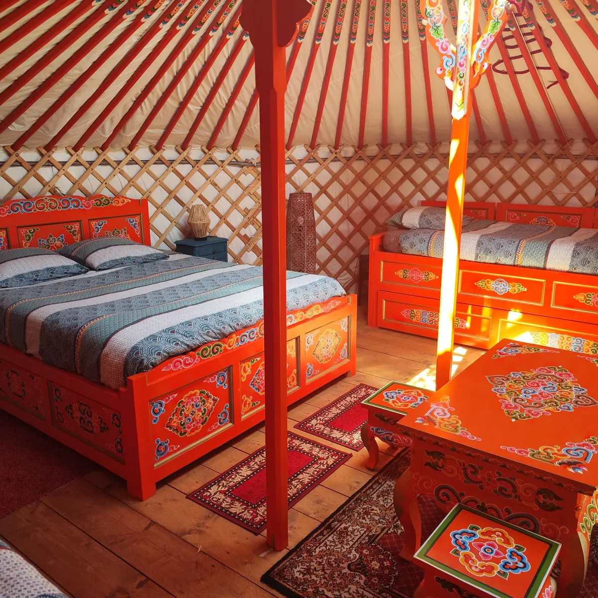 Venez vivre une expérience insolite dans une authentique yourte traditionnelle mongole, avec son mobilier atypique peint à la main et venue de Mongolie.
