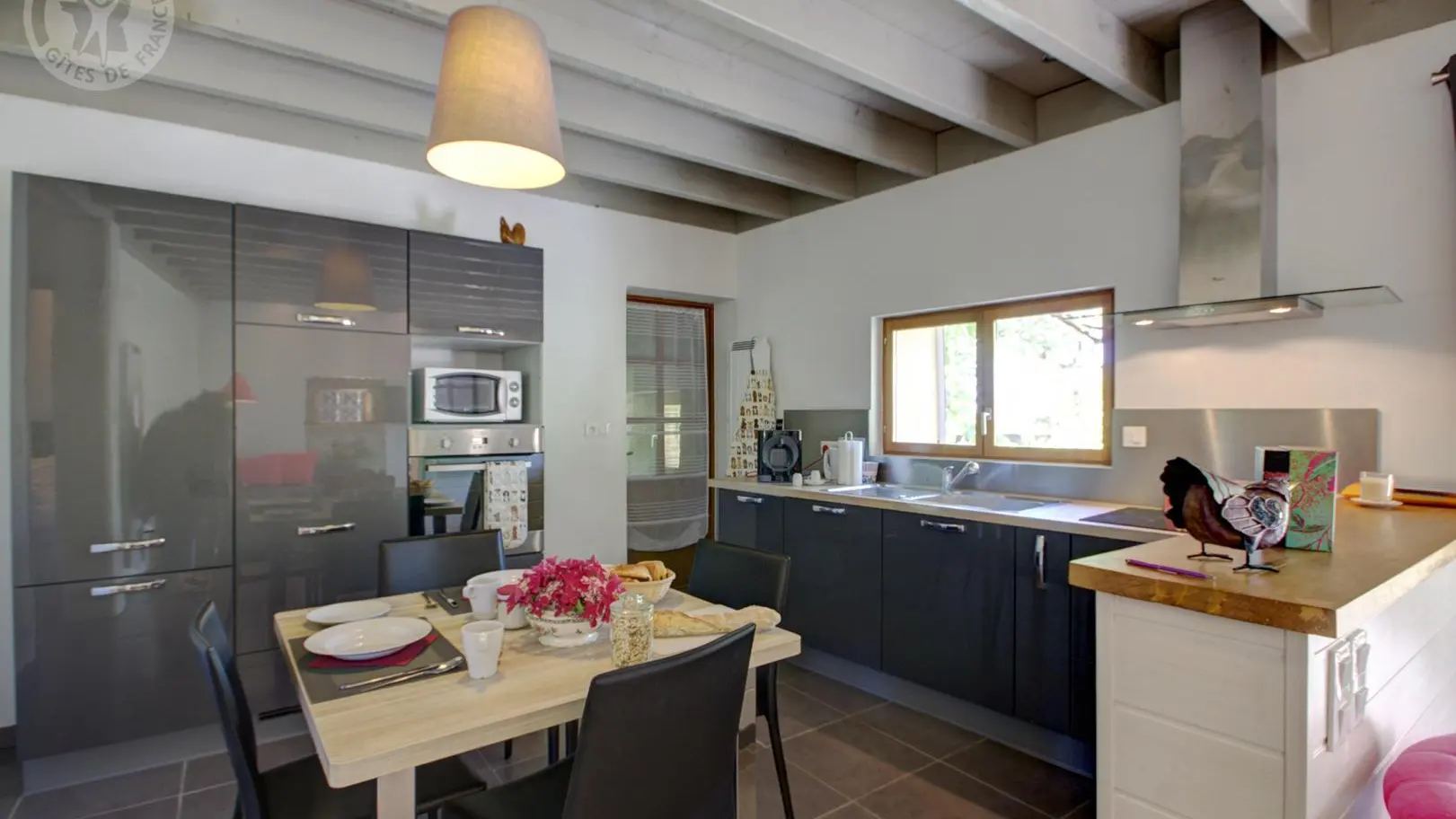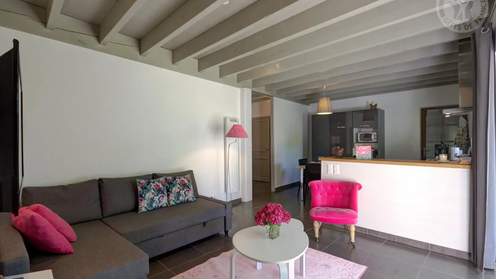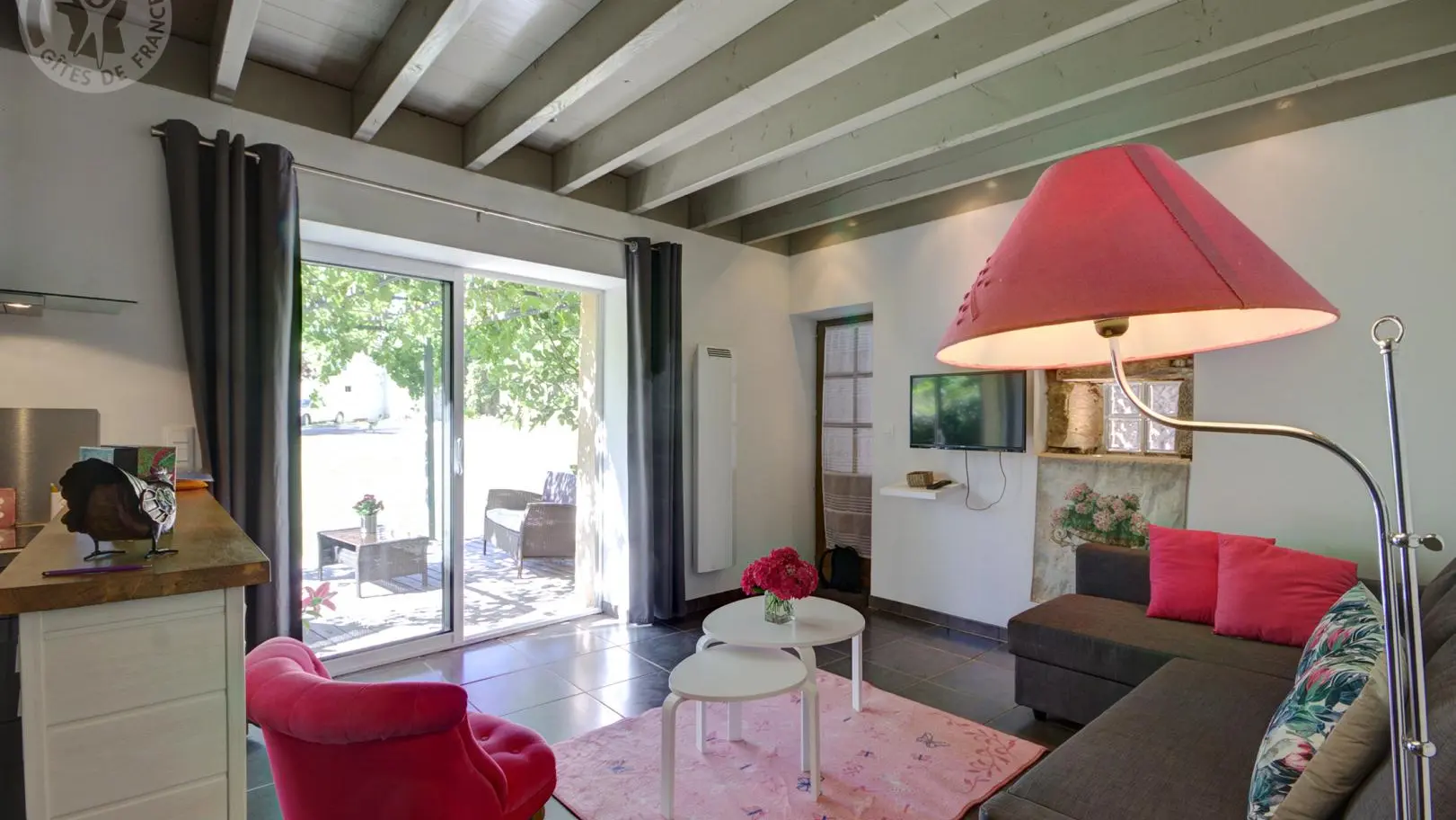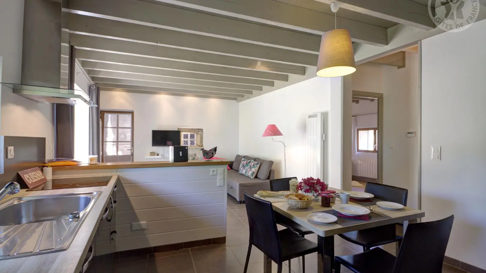 Gite de 55m² en rez-de-chaussée comprenant un grand séjour avec salon, cuisine équipée et espace repas, une chambre, une salle d'eau avec douche italienne et un WC. Garage.