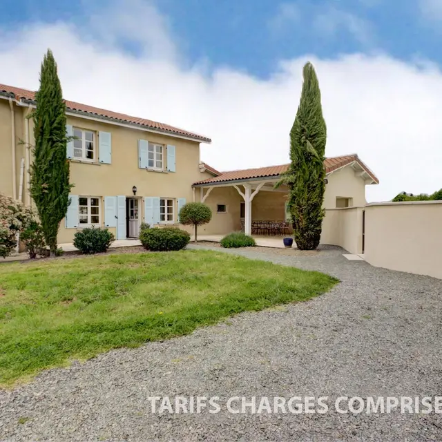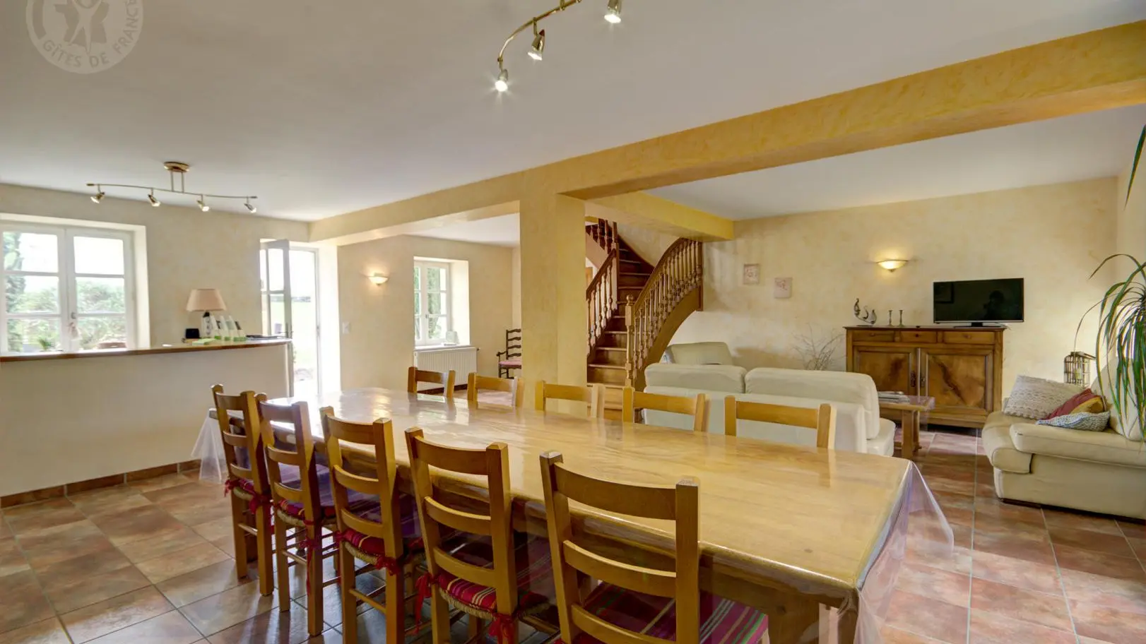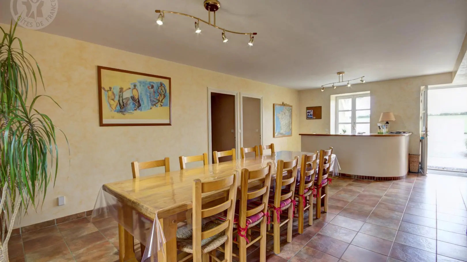 Belle maison de campagne de 230 m², mitoyenne avec un gîte 6 places ouvert en 2021. Séjour de 65 m², cuisine toute équipée, 4 grandes chambres avec leurs sanitaires privatifs, couchages en 90x200 et 160x200. Chauffage central, aspiration centralisée... Prix toutes charges comprises. Réduction -20% pour location longue durée en basse saison.