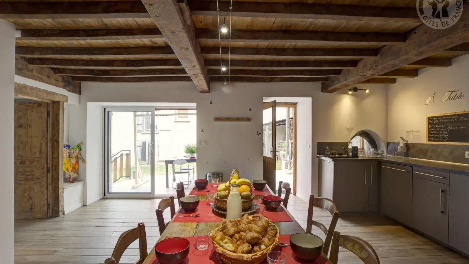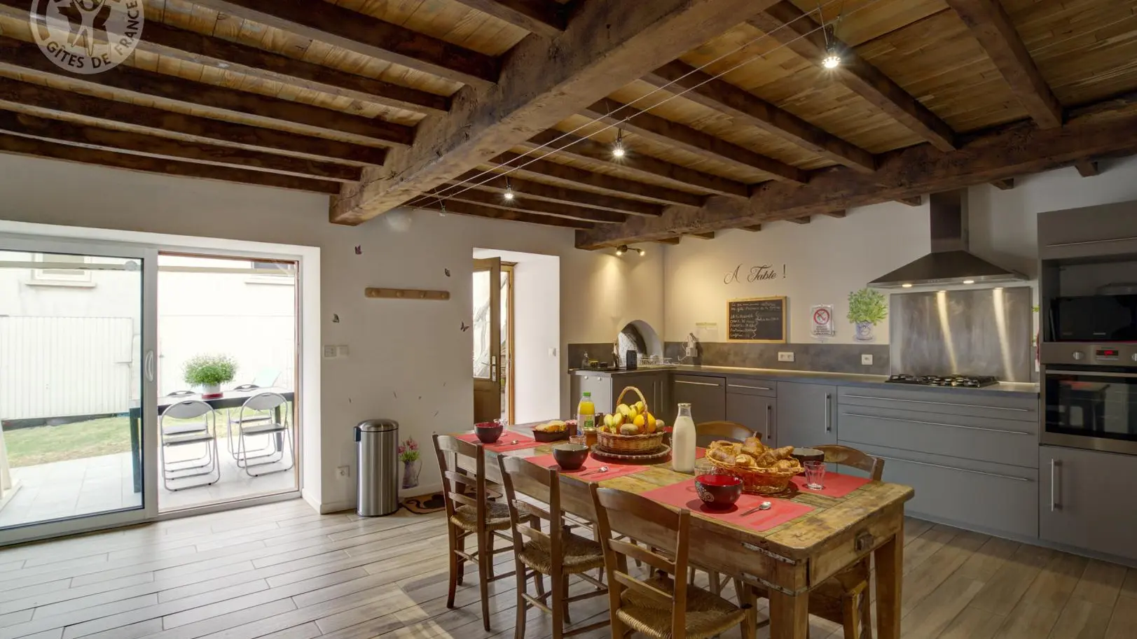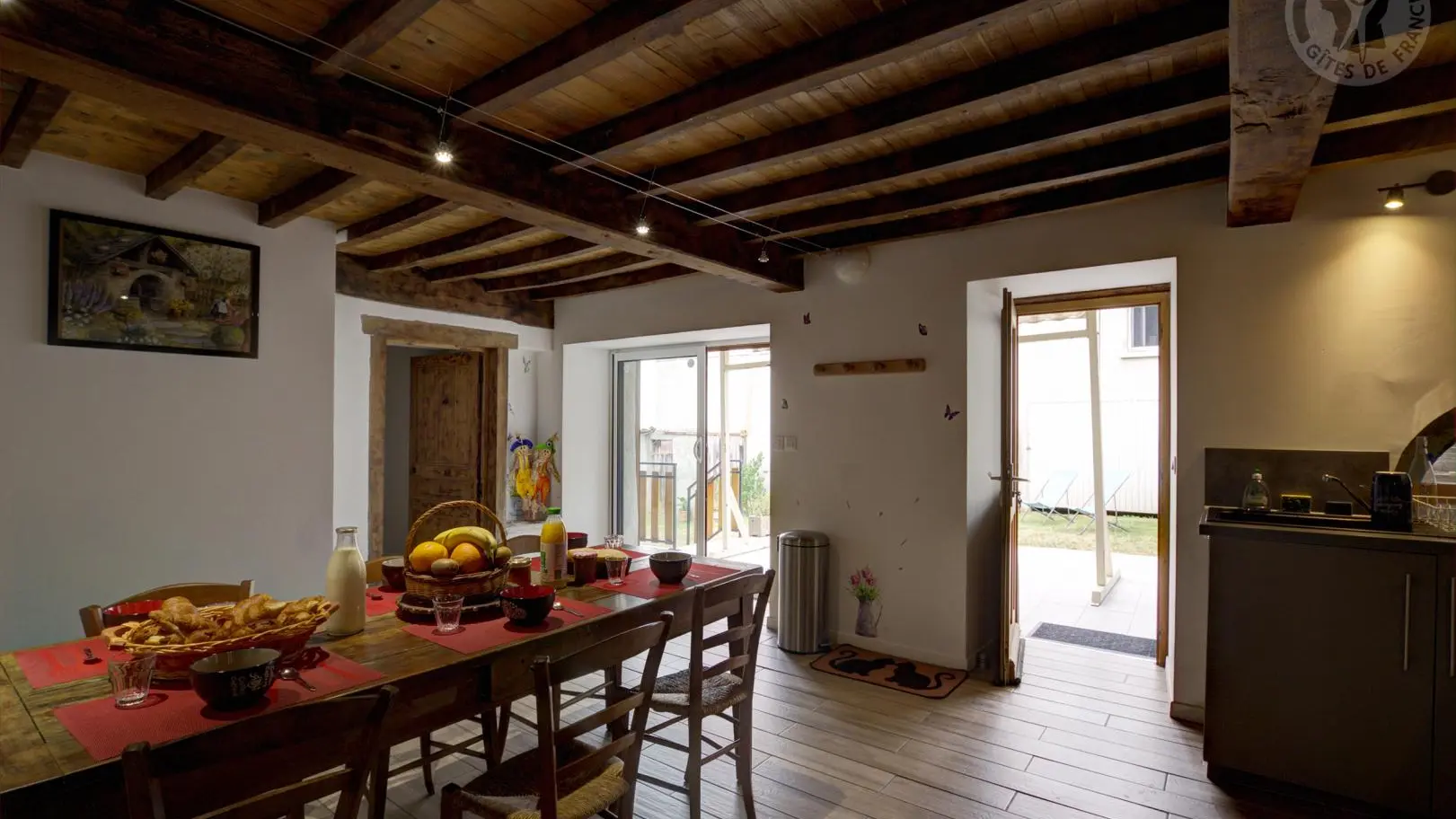 Gîte situé dans l'ancienne maison d'habitation de la ferme, avec accès indépendant, cour et terrasse privative (abords en cours de finition lors de l'été 2020). En pleine campagne à seulement 1 km du bourg du village et toutes ses commodités. Pour votre confort, les draps sont fournis, tout comme le bois pour le poêle. Vous apprécierez la terrasse de plain-pied avec le séjour, orientée plein sud, ou si vous préférez l'ombre, l'ancienne grange attenante. Le propriétaire, agriculteur (éleveur laitier et de volailles label rouge), vous proposera une visite de sa ferme, pour vivre un moment inoubliable au contact des animaux. Cette très ancienne maison était présente sur le cadastre Napoléonien en 1820, elle est typique de l'architecture du Roannais, avec son balcon, ses encadrements de portes et fenêtres en bois...