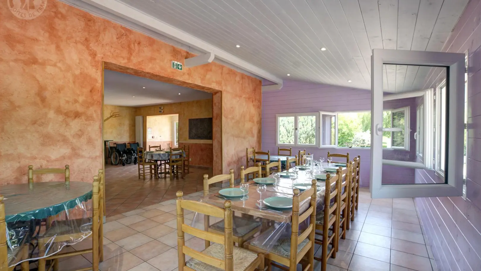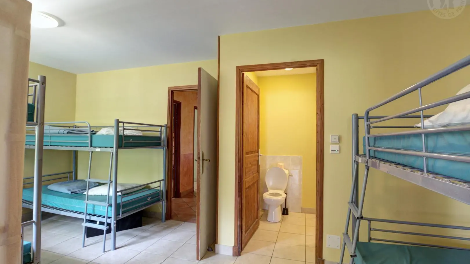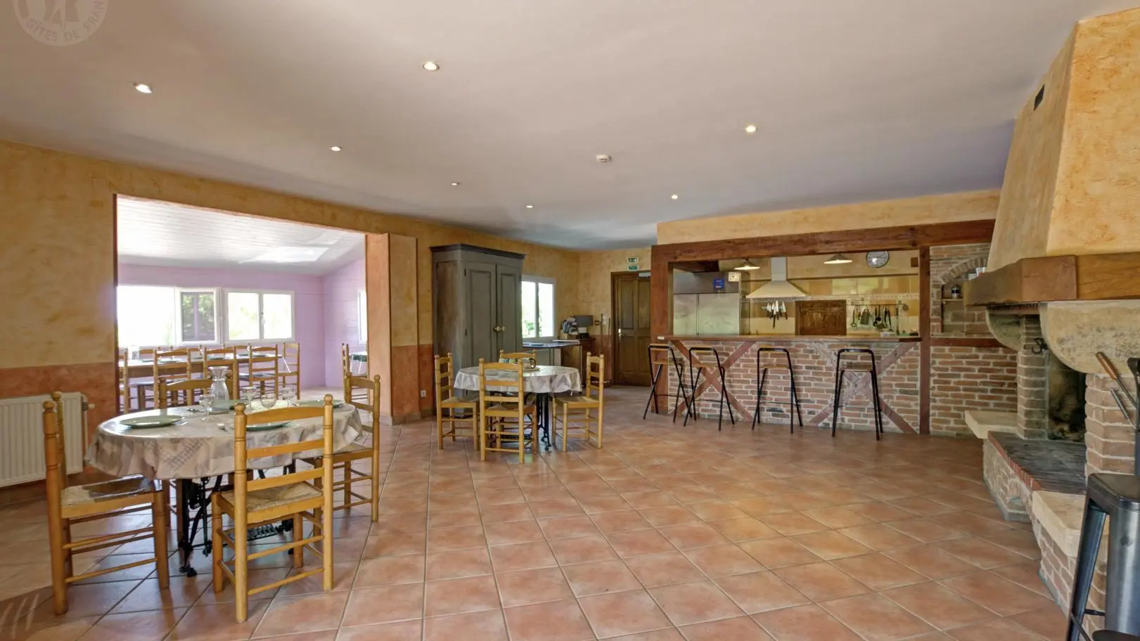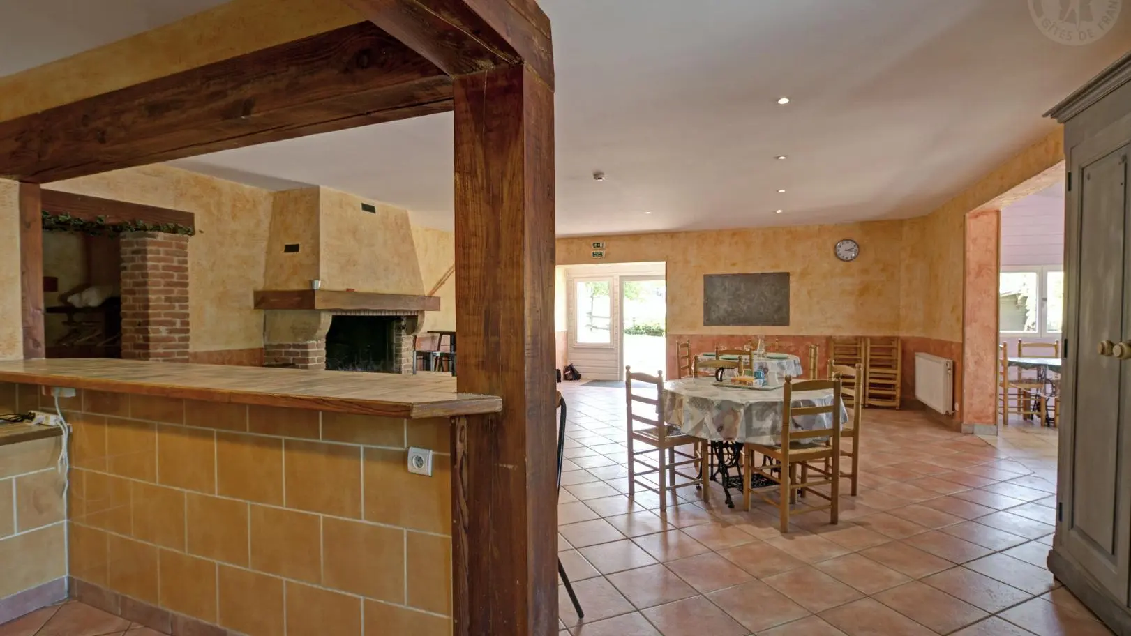 Gîte de groupe de 350 m² pouvant accueillir 34 personnes dans 7 chambres, chacune équipée de sanitaires privatifs. Séjour avec cheminée, tables de ferme, coin-cuisine, salon, l'ensemble de ces pièces avec accès direct sur la terrasse et la pergola.
