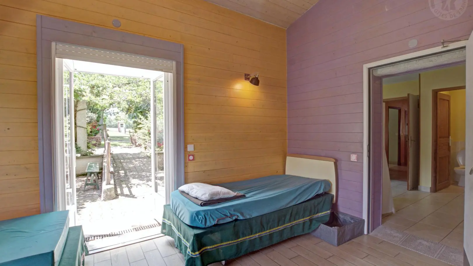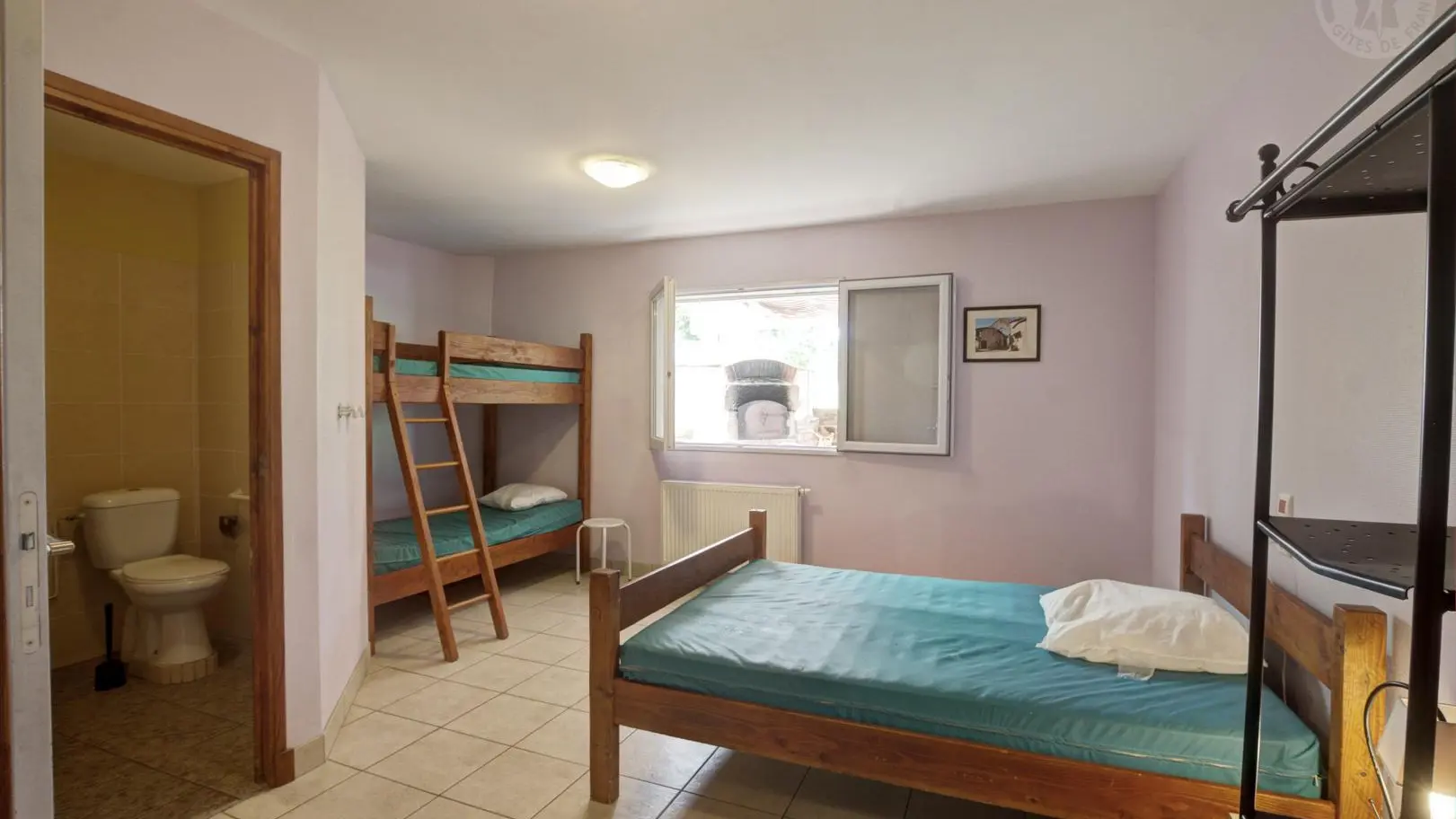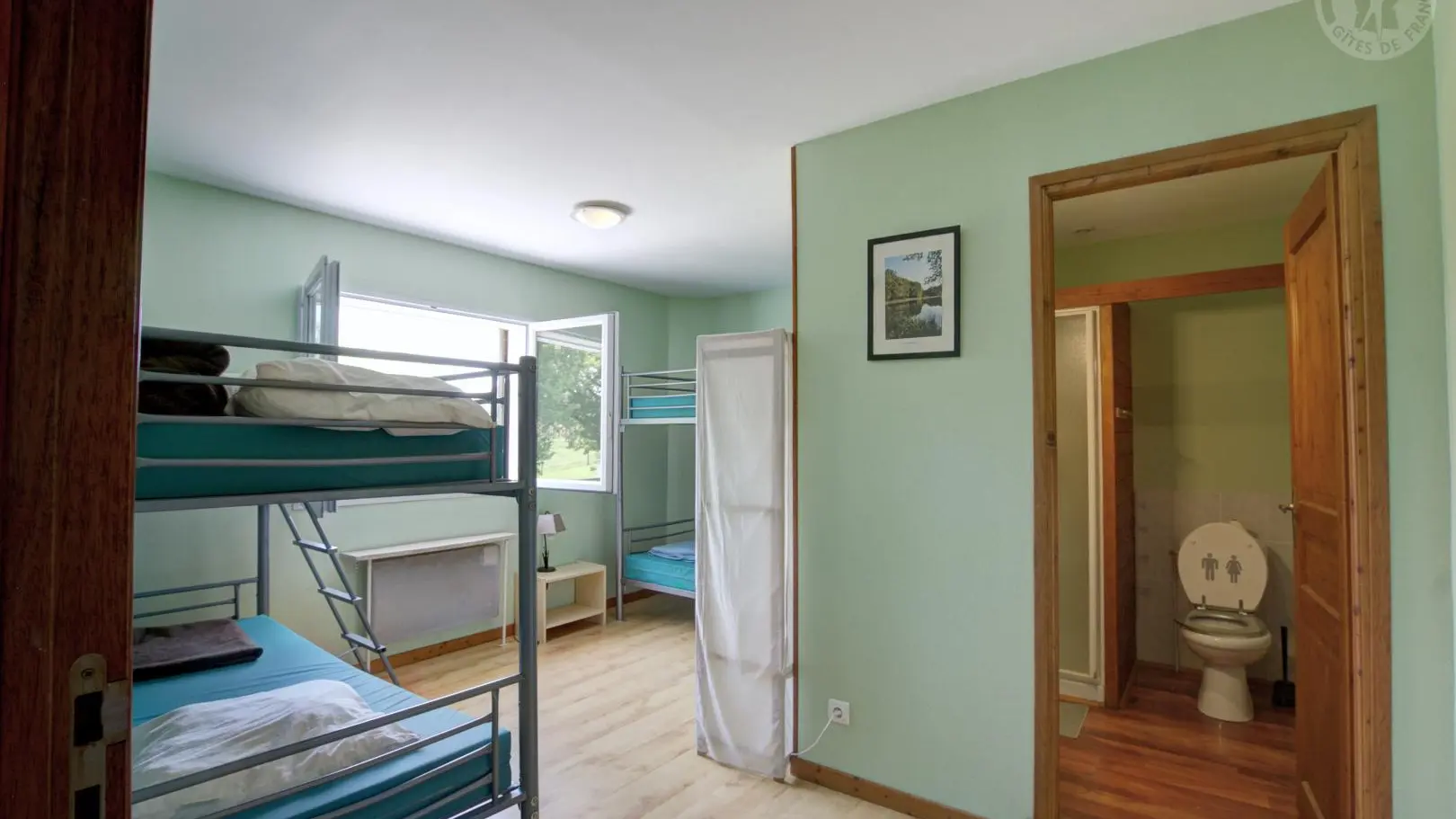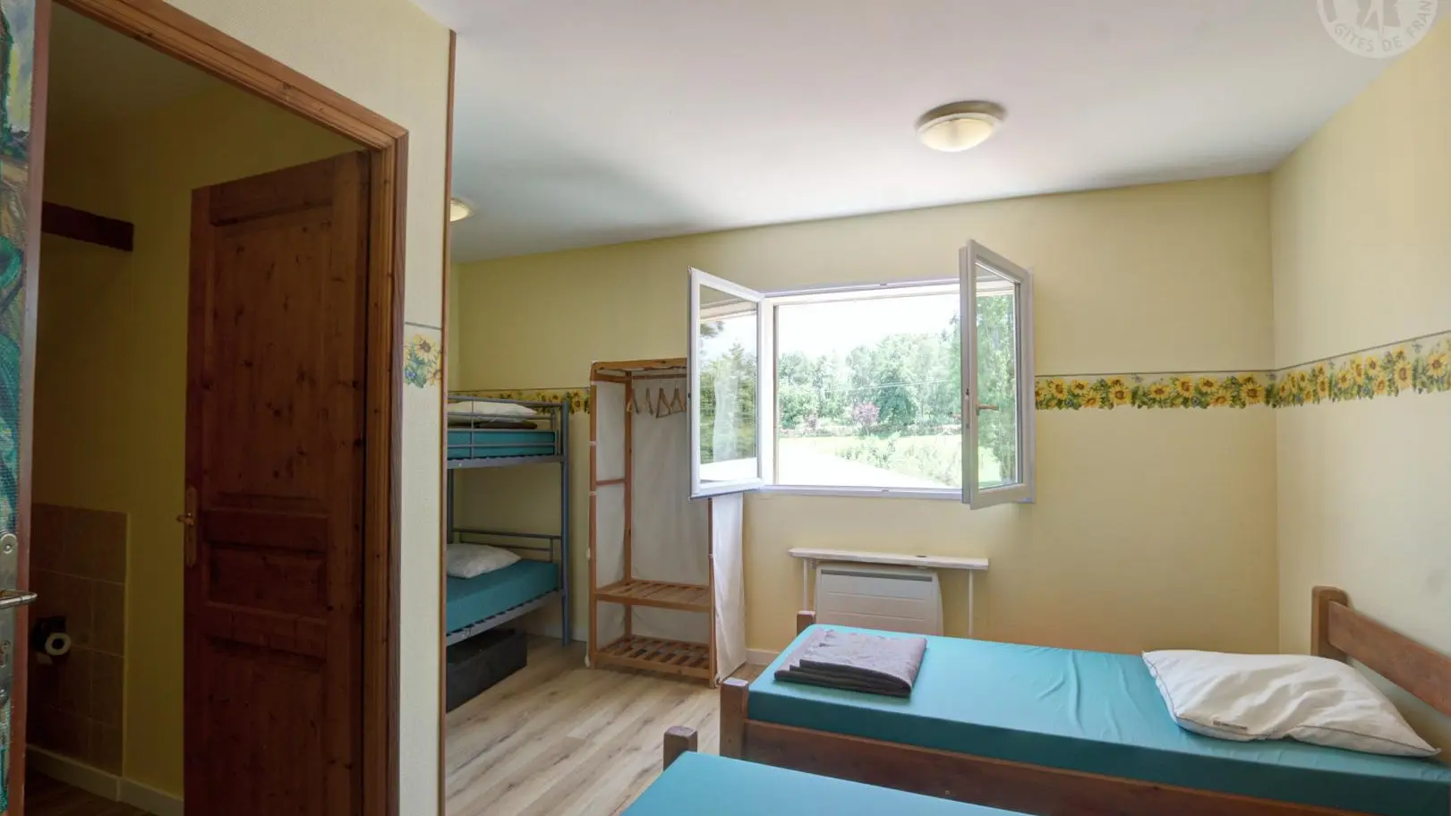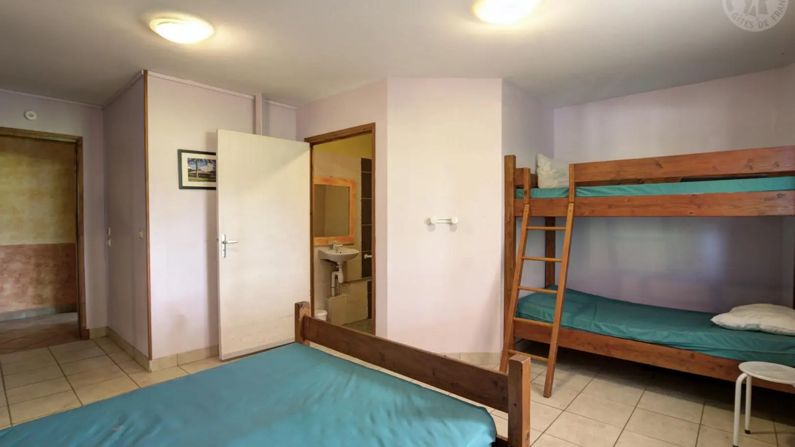 Gîte de groupe de 350 m² pouvant accueillir 34 personnes dans 7 chambres, chacune équipée de sanitaires privatifs. Séjour avec cheminée, tables de ferme, coin-cuisine, salon, l'ensemble de ces pièces avec accès direct sur la terrasse et la pergola.