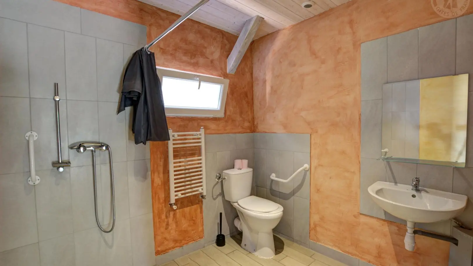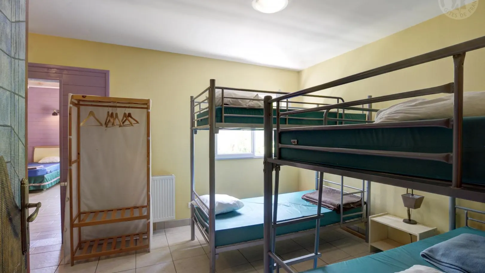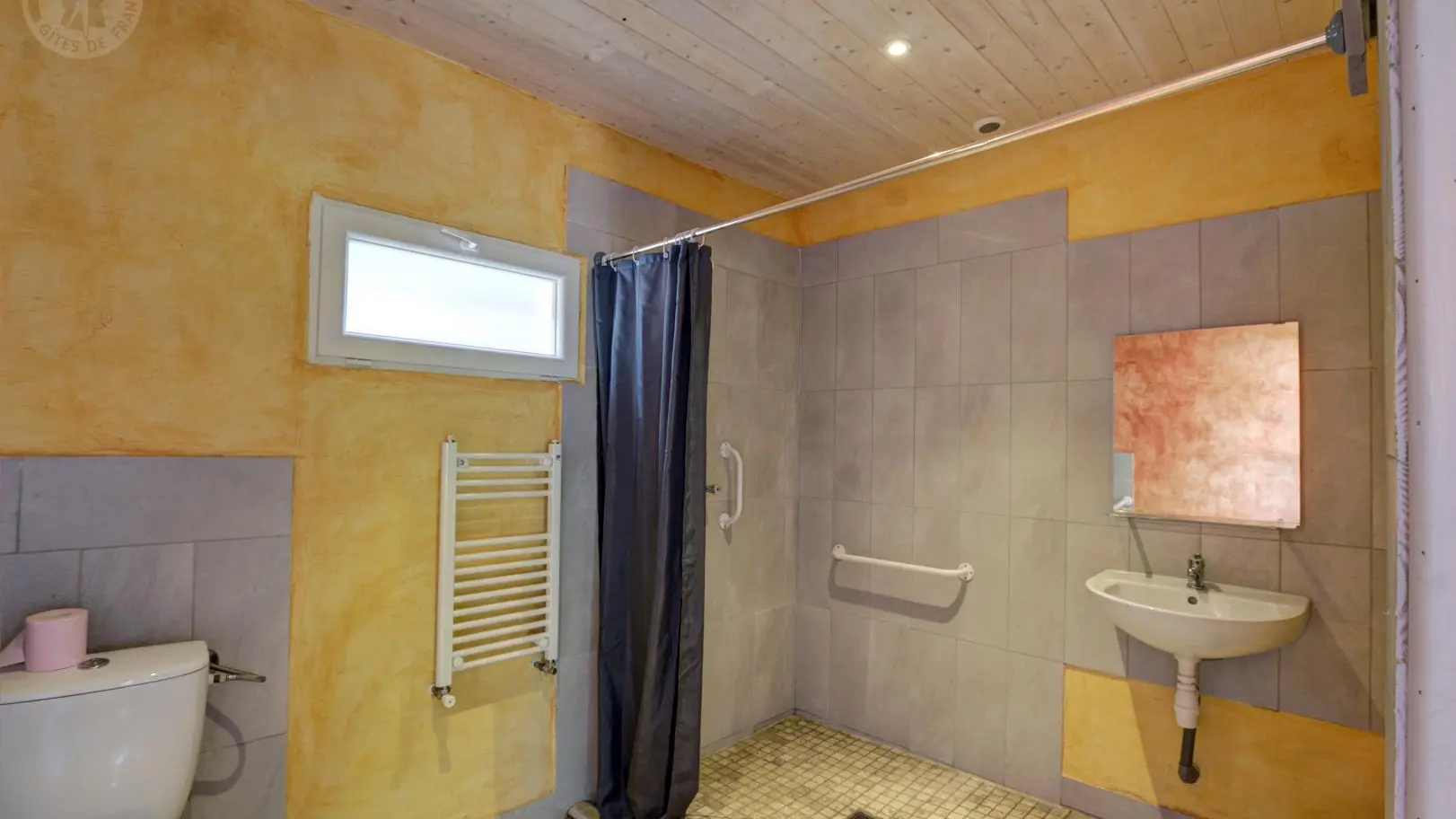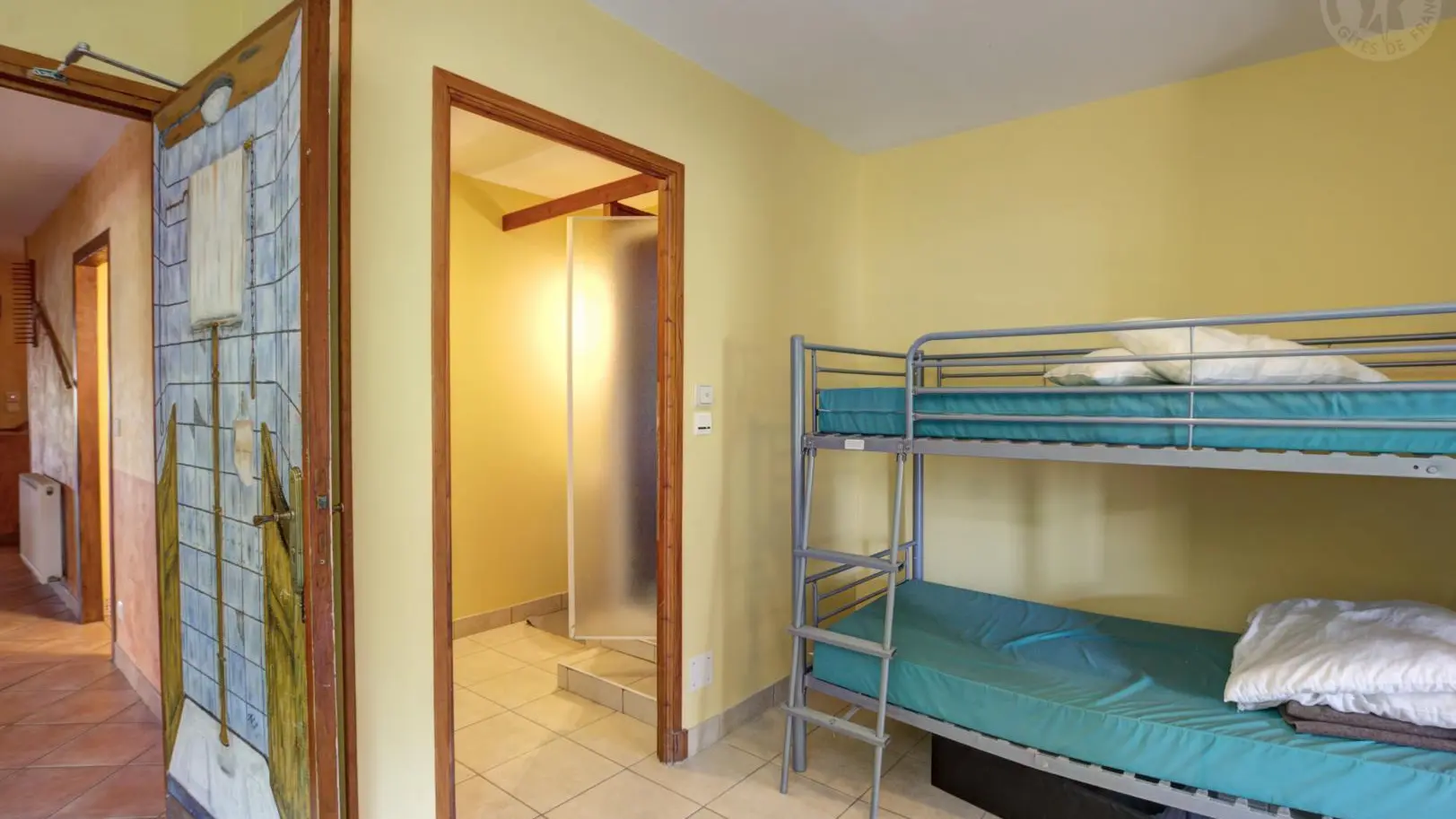 Gîte de groupe de 350 m² pouvant accueillir 34 personnes dans 7 chambres, chacune équipée de sanitaires privatifs. Séjour avec cheminée, tables de ferme, coin-cuisine, salon, l'ensemble de ces pièces avec accès direct sur la terrasse et la pergola.