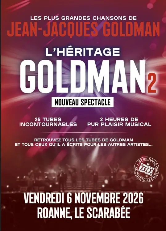 Découvrez le nouveau spectacle époustouflant de « l’Héritage Goldman 2 », où les tubes intemporels de Jean-Jacques croisent les plus belles chansons qu’il a écrites pour les plus grandes voix de la chanson Française telles que Céline Dion, Johnny Hallyday, Patricia Kaas, Khaled et Florent Pagny.