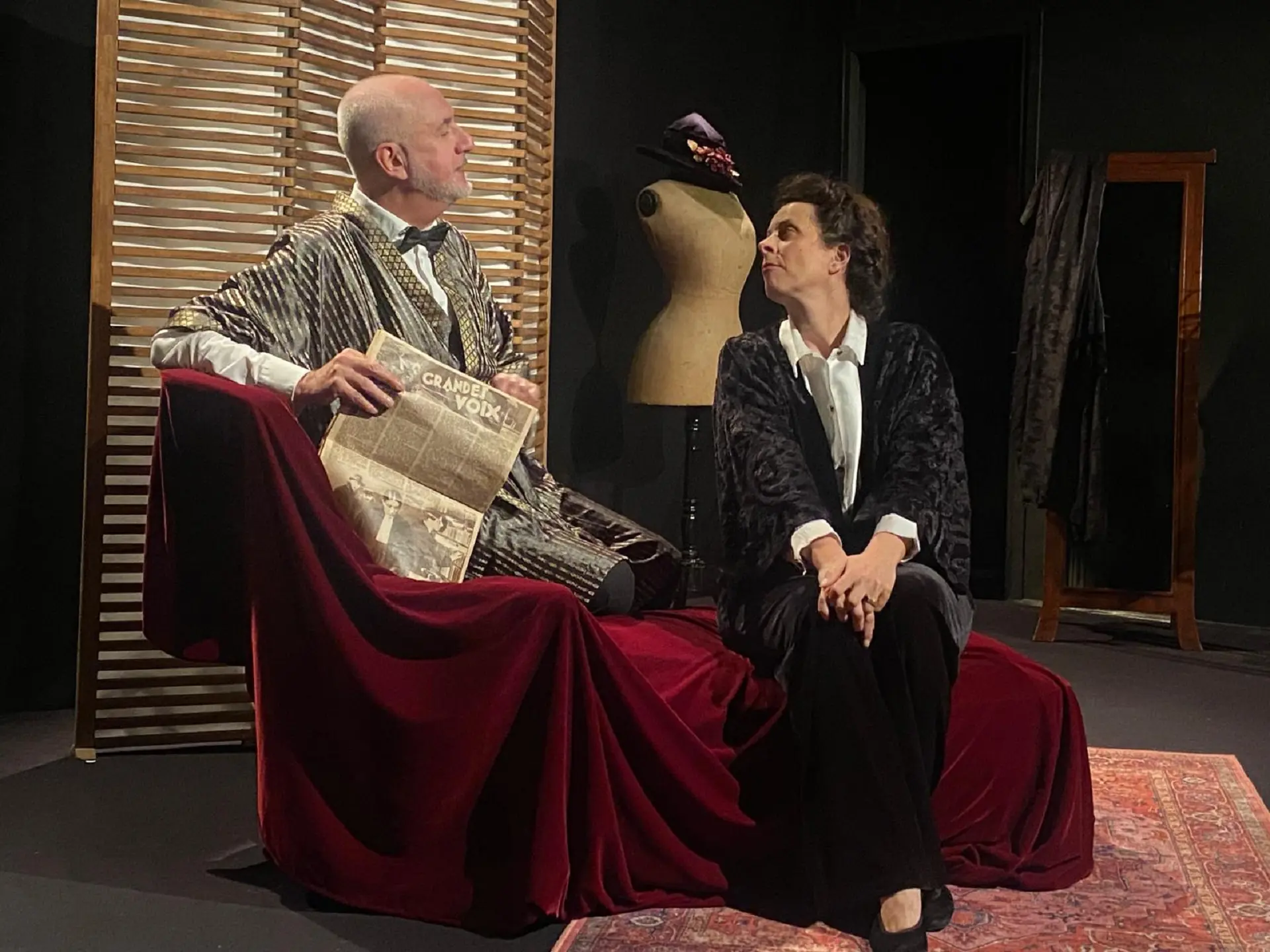 Sous l’œil bienveillant d’un majordome, l’espace de la loge se transforme en un lieu magique avec strass et paillettes ; lieu de conquête de la richesse et du pouvoir ; antichambre de la gloire et de la chute.