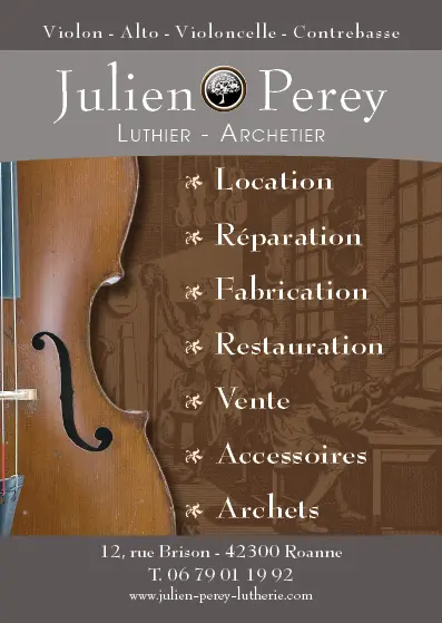 Luthier installé dans le centre de Roanne, Julien Perey est spécialiste des instruments du quatuor. Que ce soit pour un violon, alto, violoncelle ou contrebasse, il propose de la location, restauration, fabrication ou vente.