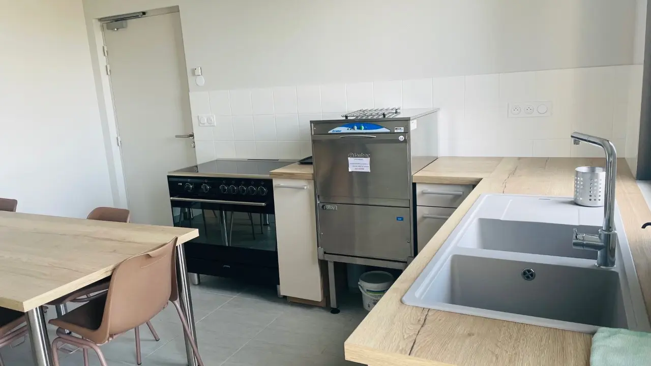 La grande salle de réception du rez-de-chaussée est accessible PMR. Elle est sonorisée et équipée d’un vidéo projecteur, d’un grand écran, de 10 tables de 1.80 m x 0.80 m et de 80 chaises. Elle dispose d’une cuisine attenante entièrement équipée avec vaisselle nécessaire pour 80 convives. Les sanitaires sont accessibles depuis le hall d’entrée. Un local technique ainsi qu’une penderie à l’entrée facilitent l’organisation et le rangement. Vous pouvez également profiter du clos, un espace engazonné de 1 700 m2. Cet espace peut servir comme aire de jeux et/ou de stationnement pour les véhicules.