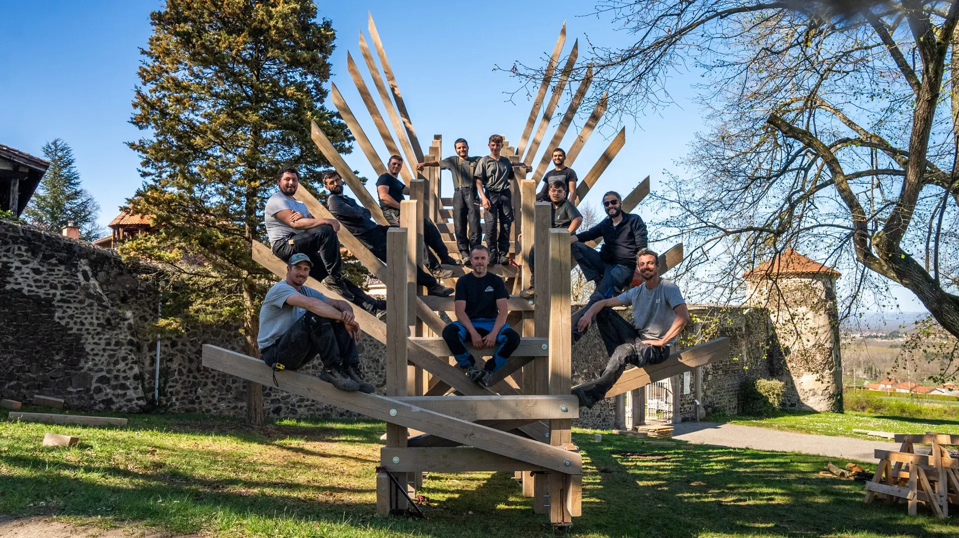 Implantée à l’entrée Sud du château, au départ du chemin pédestre de Bélizar (chemins de l’Astrée), la sculpture nous invite à prendre le temps d’une pause, à observer le résultat des milliers d’heures de bénévoles. Sa forme est progressive et exponentielle, appuyée au sol et tournée vers le ciel, elle nous raconte l’ascension patiente du projet, les efforts et le chemin parcouru à partir d’une intention concrète et terre à terre, celle de rebâtir ce lieu : 150 000h d'engagement bénévole porté par la force du collectif et l'envie du "faire ensemble".