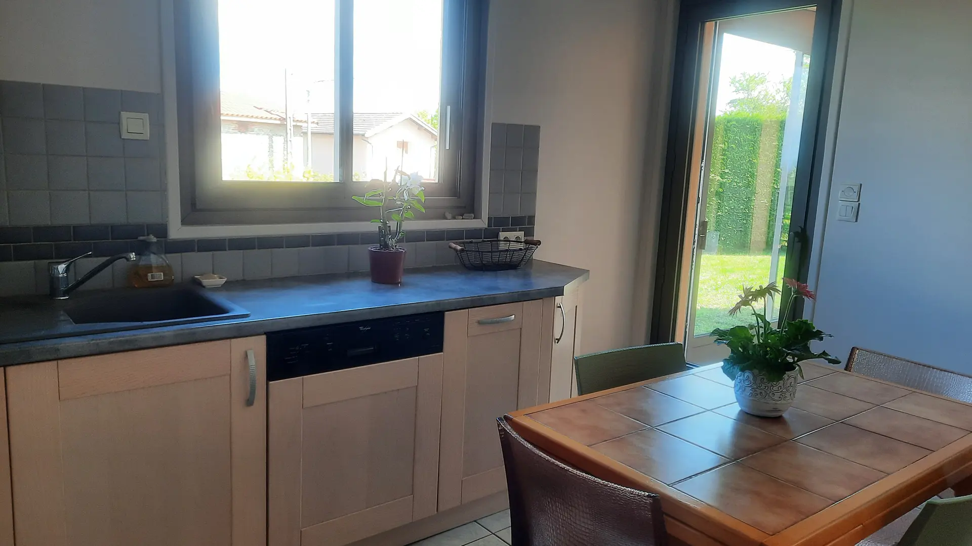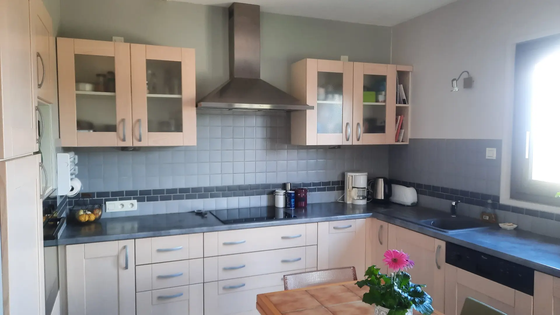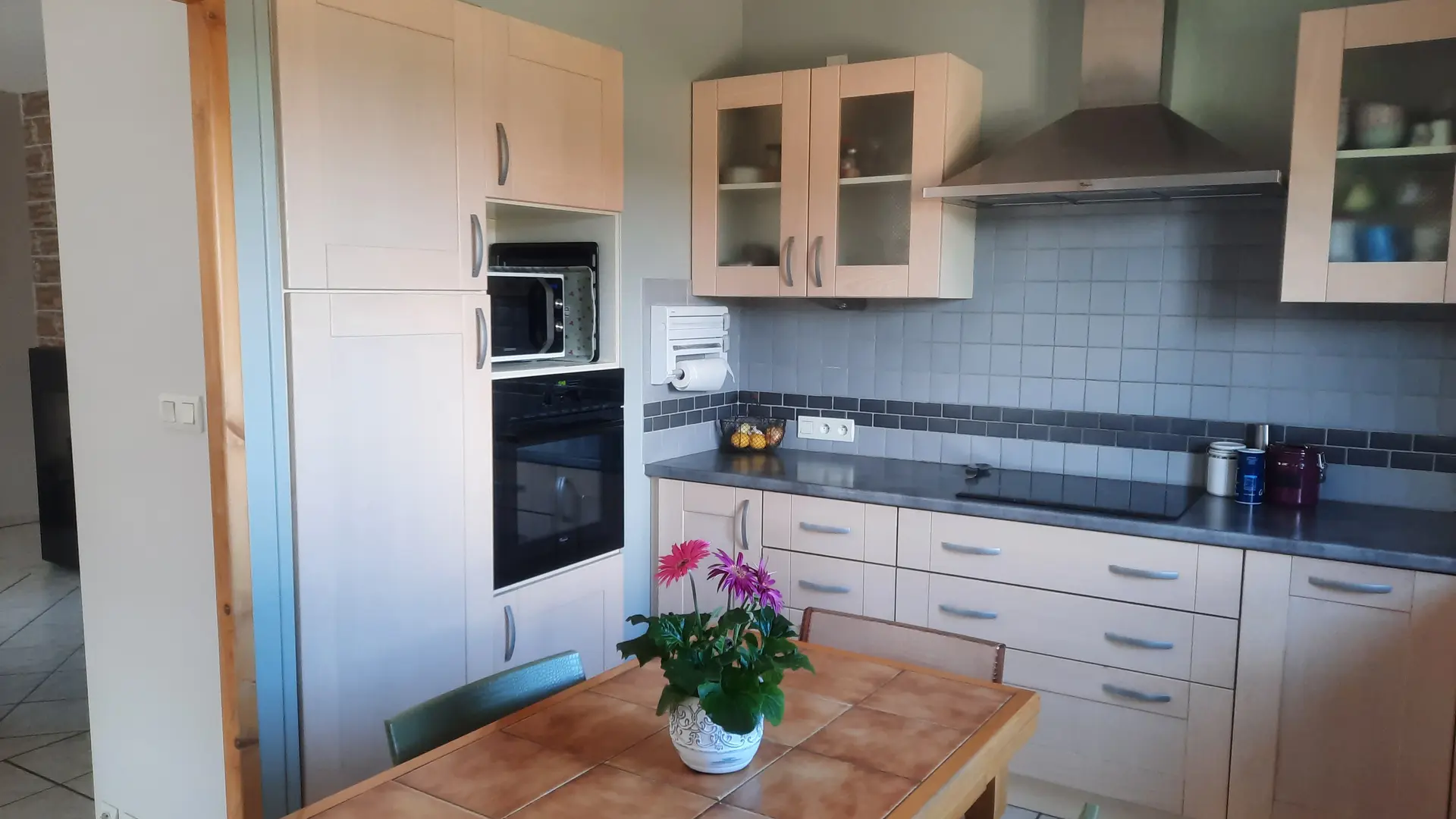Cuisine semi-ouverte de 10 m², entièrement équipée avec plaque induction, four et four micro-onde, réfrigérateur, lave-vaisselle, cafetière électrique, bouilloire et grille-pain. Toute la vaisselle pour manger et cuisiner.