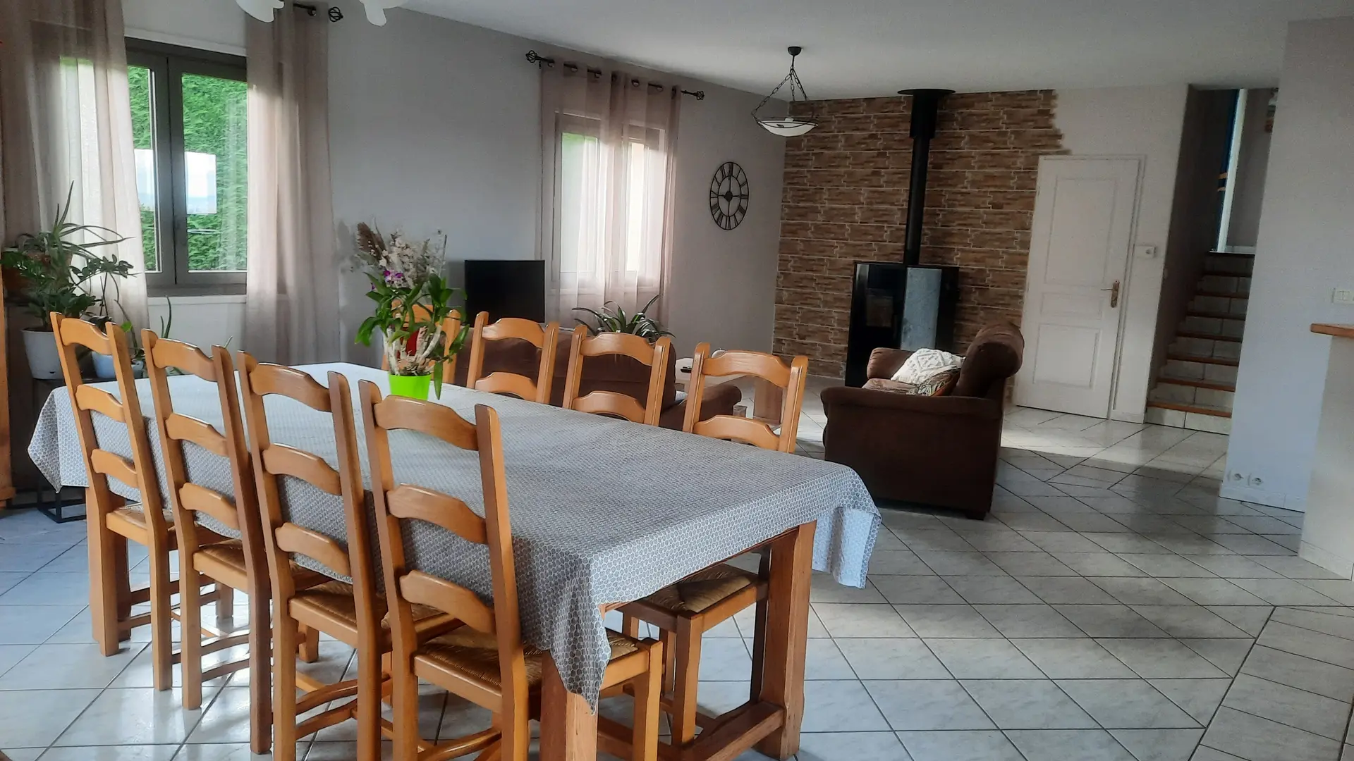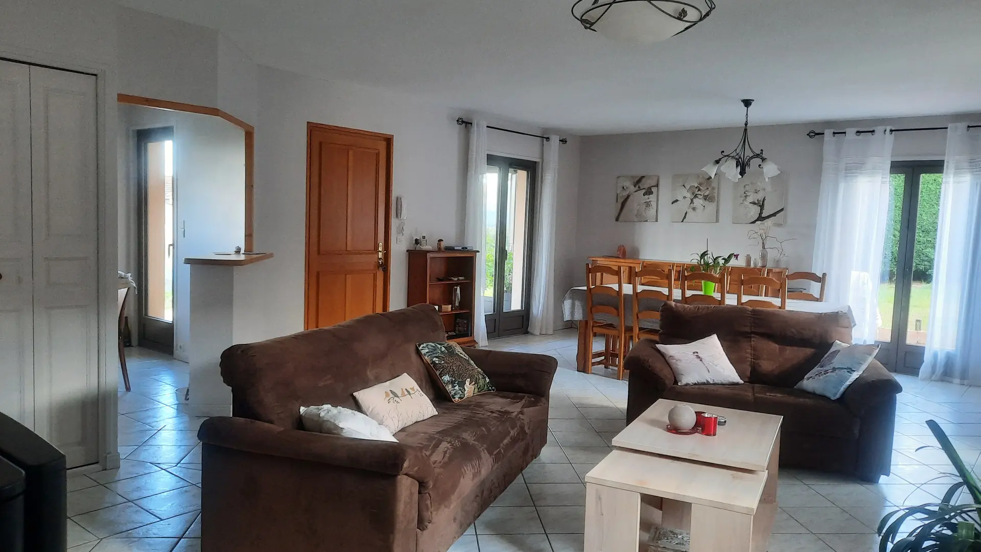 Séjour et salle à manger de 46 m² avec 1 grande table à manger et 1 espace salon avec canapés et téléviseur.