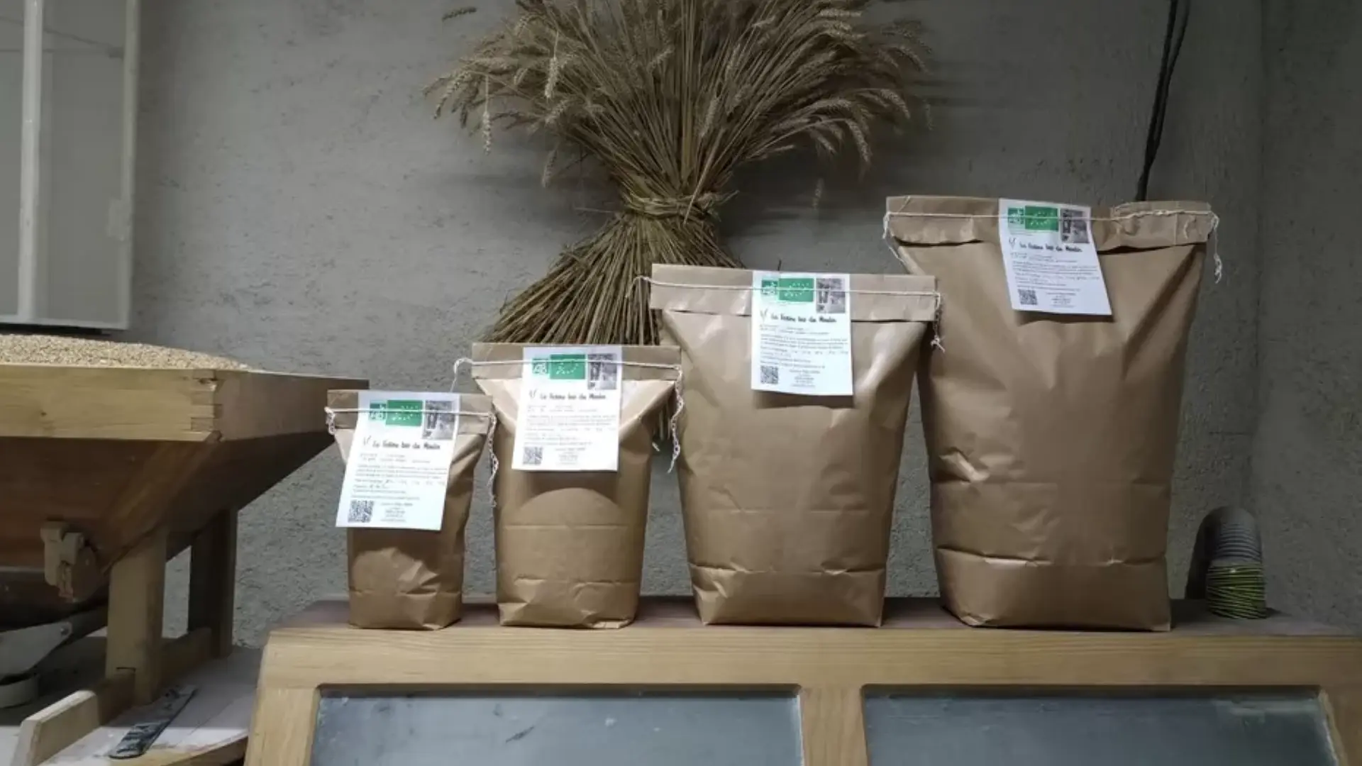 Le petit moulin à meule de pierre permet de dérouler les grains de blé pour en extraire une farine avec le maximum d'éléments nutritifs. Différents maillages permettent d'obtenir une farine bio : complète, semi-complète et farine blanche.