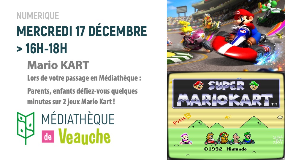 Lors de votre passage en Médiathèque : parents, enfants défiez-vous quelques minutes sur 2 jeux Mario Kart ! Qui seront les plus forts : les enfants sur Switch avec le jeu vidéo Mario Kart 8 (jouable à 4 simultanément) ou les parents sur la console Nintendo Classic Mini avec le premier Mario Kart original sorti en 1992 ?