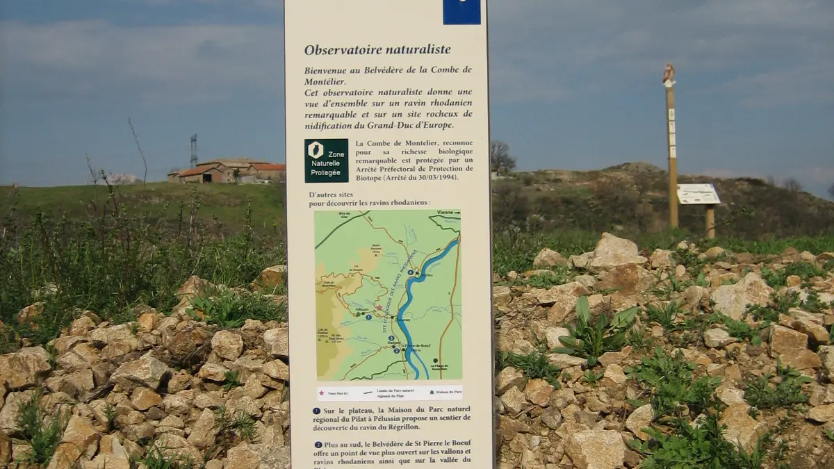 Dominant la combe de Montelier, le belvédère donne une large vue sur ce ravin inaccessible. Dès mars, au crépuscule, vous pourrez y entendre le chant du Hibou grand Duc qui niche en contrebas. Peut-être même l’apercevoir si vous avez de la chance.