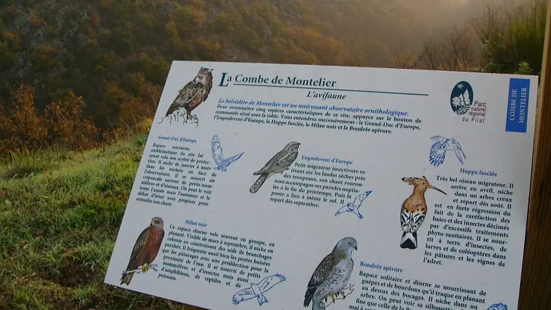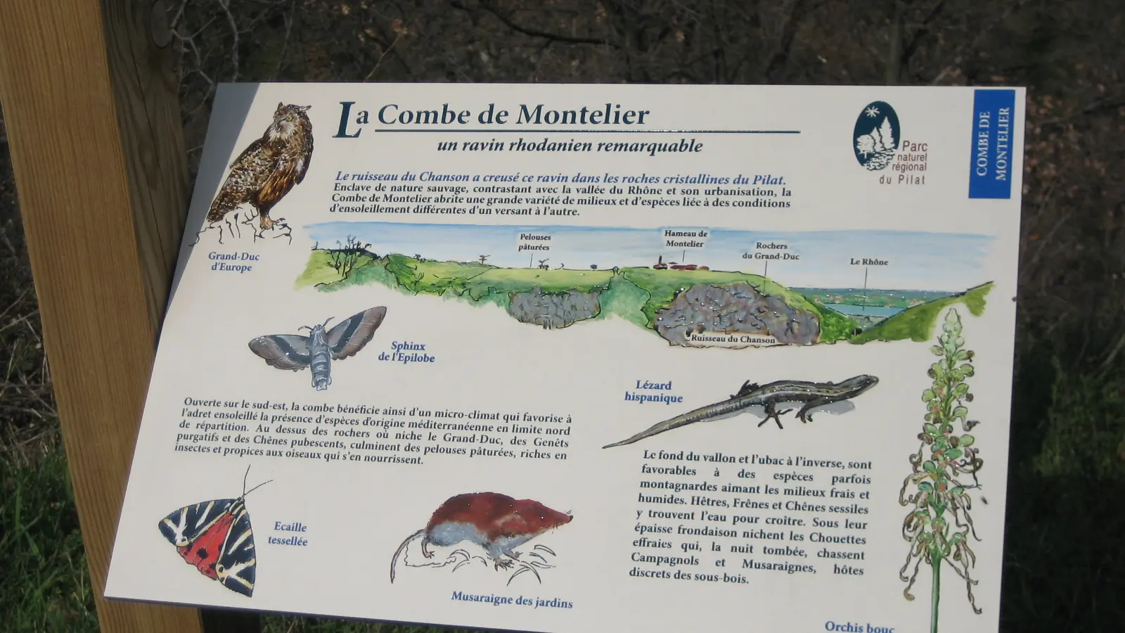 Grâce aux panneaux, vous saurez tout sur l’avifaune présente dans la Combe : Grand Duc, Milan Noir, Engoulevent d’Europe, Bondrée Apivore et la Huppe Fasciée. Vous découvrirez aussi comment le ruisseau « Le Chanson » a creusé ce ravin et comment s’organise la vie dans ce vallon en fonction de l’exposition au soleil.