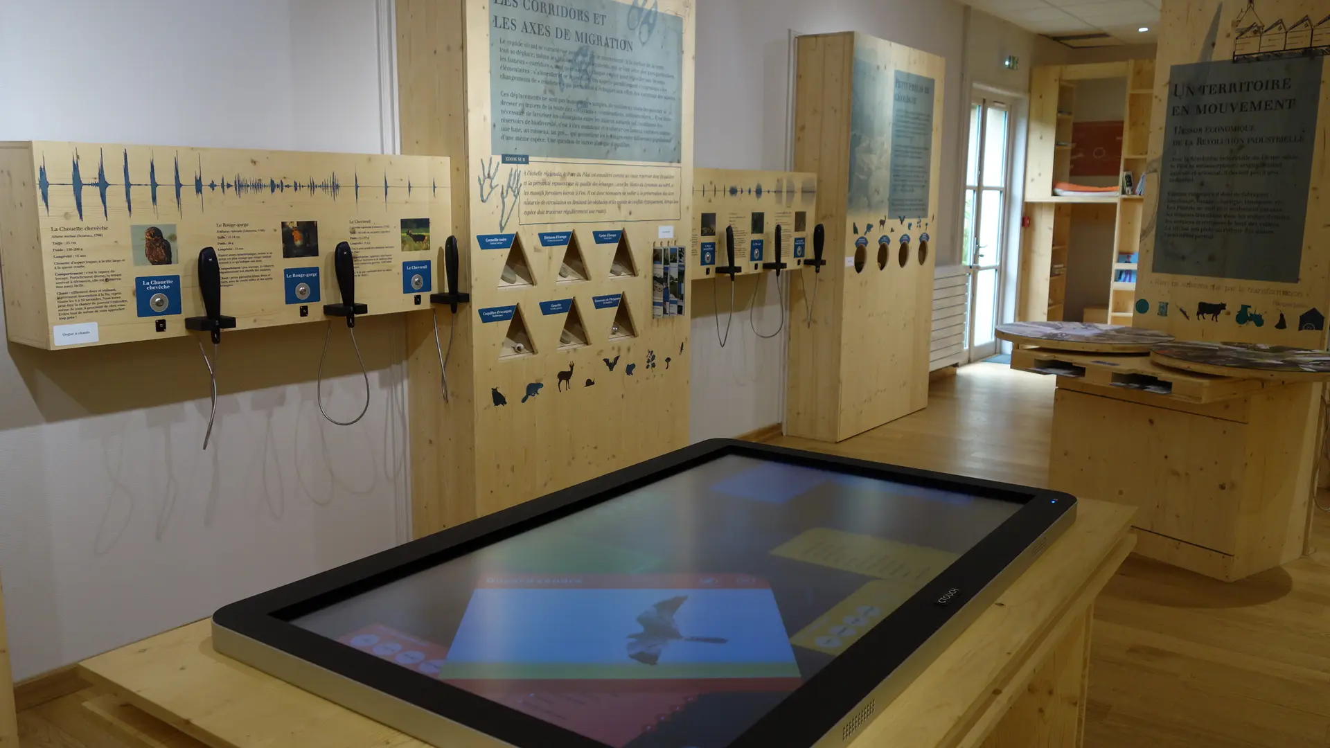 L’espace de découverte propose une approche sensorielle, avec des objets à toucher et des odeurs spécifiques par exemple. Les repérages dans l’espace sont facilités par l’organisation des lieux. Une attention particulière a été apportée pour distinguer les différents niveaux de contenu, la lisibilité de l’ensemble a aussi été travaillée.