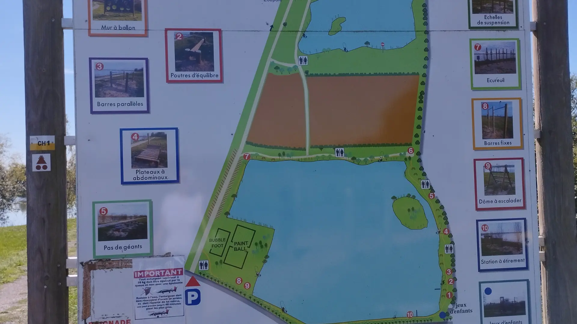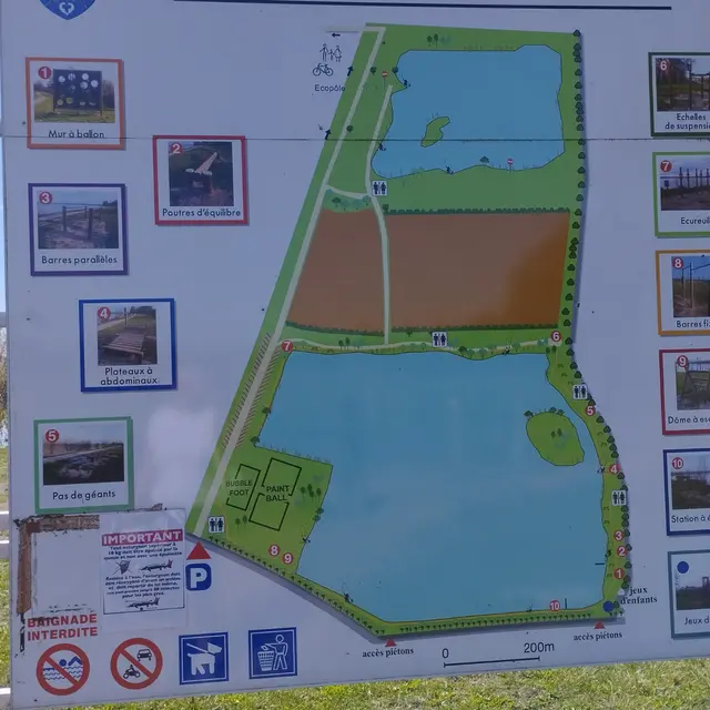D'une assez grande variété, vous retrouverez aussi des échelles de suspension, un écureuil, des barres fixes, un dôme à escalader, une station d'étirements et une aire de jeux pour enfants. Il complète également le bubble-foot et le paint-ball déjà présents sur le site. Des toilettes sont à disposition sur place.