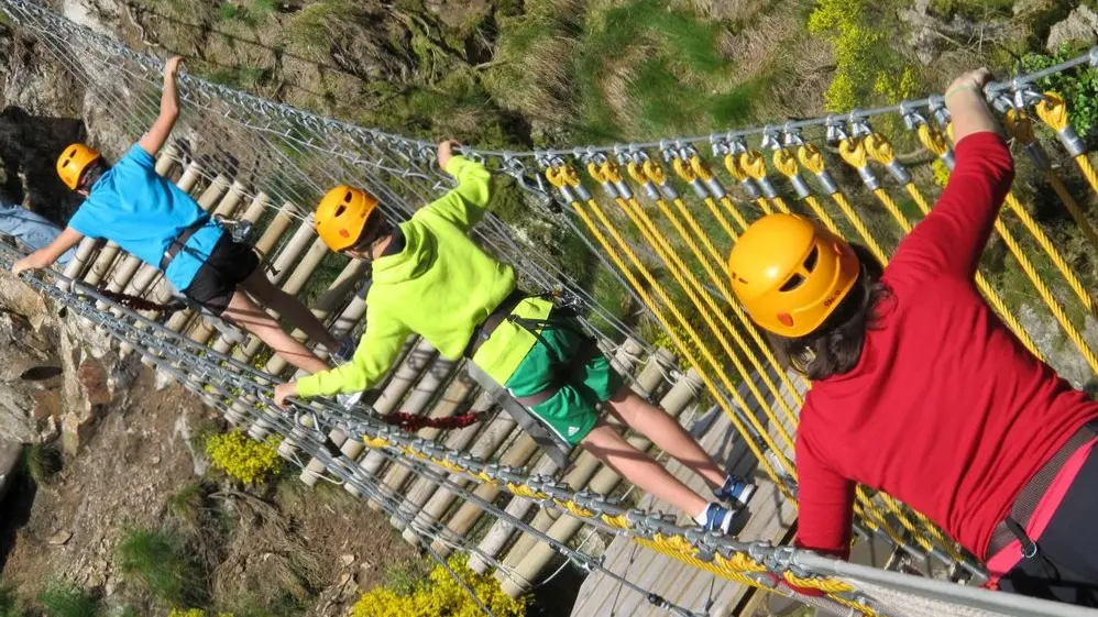 Parcours sur rocher et agrès mixte de 30m composé d'un filet suspendu, de sauts de puce, et de balançoires.