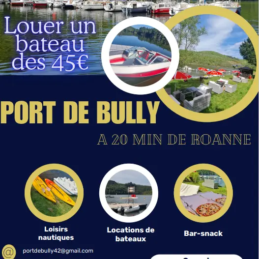 Le port de plaisance de Bully vous accueille tout au long de la semaine dans un cadre convivial. Profitez d’un emplacement favorable et d’un lieu exceptionnel. Location de pédalos, canoës, paddles et bateaux. Paillotte/bar/snack ouverte d'avril à octobre.