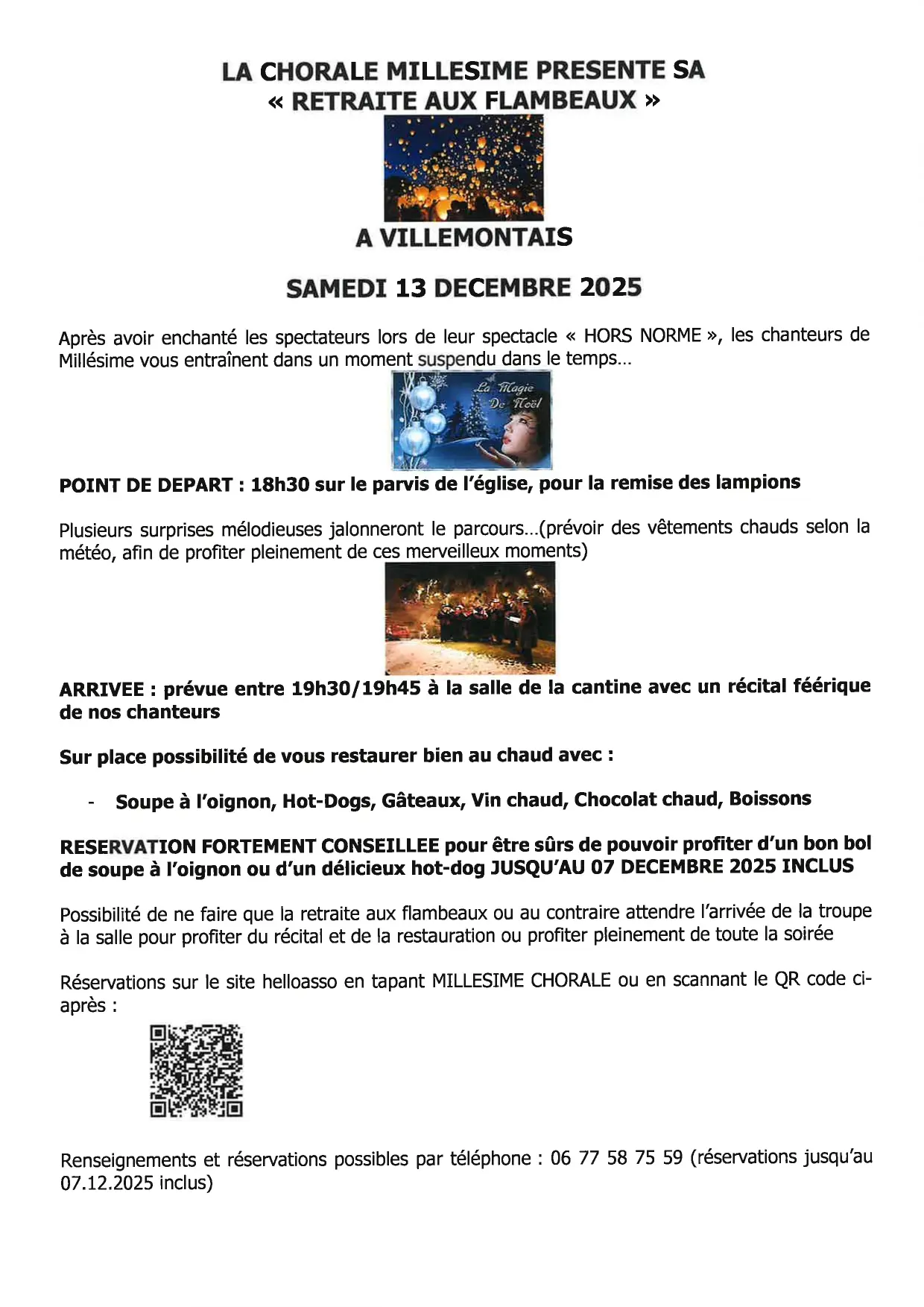 Profitez de moments d'enCHANTement par les voix des choristes de Millésime, avant de terminer bien au chaud à la salle de la cantine, pour profiter d'un récital de la chorale, plein de vie, d'émotion et de bonne humeur… Sur place vous pourrez vous délecter d'un vin chaud, d'un chocolat chaud, de boissons ou encore de parts de délicieux gâteaux… Pour les plus grandes faims, soupe à l'oignon et hot-dogs vous attendent… Un moment de pure convivialité, tous réunis à l'approche des fêtes de fin d'année.