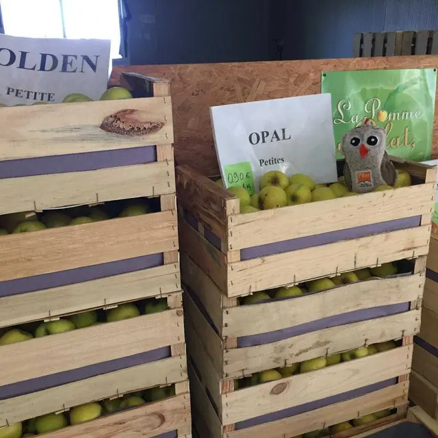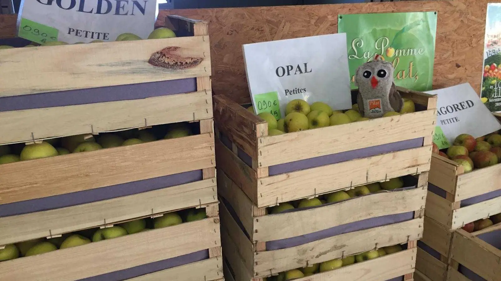 vente de fruits de saisons (pomme, poire, pêches) et jus de fruits