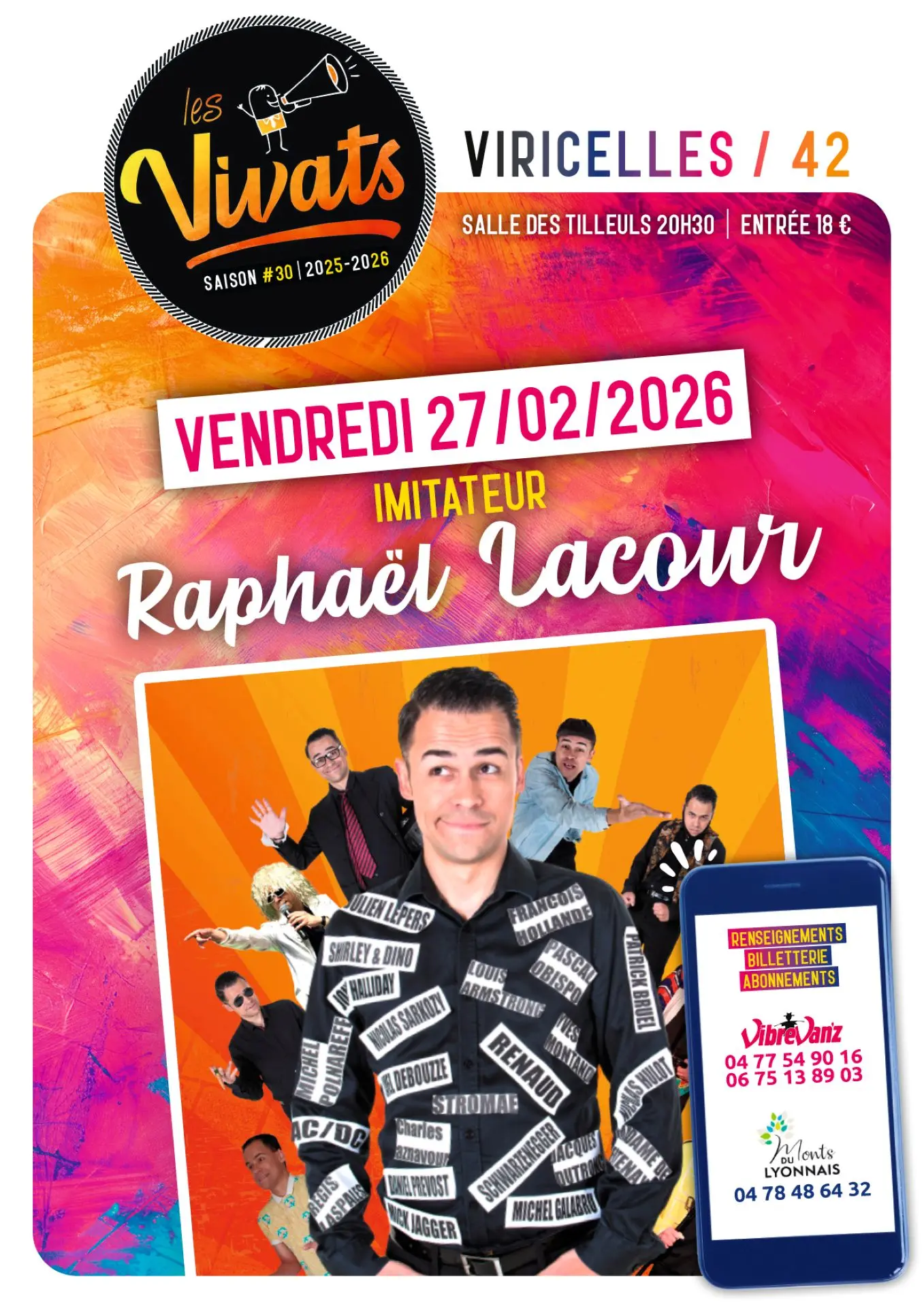 Depuis une quinzaine d'années, le parcours de Raphaël LACOUR lui a permis notamment de participer à plusieurs émissions de TV "Les coups d'humour", "Les imitateurs associés", "On n'est pas couché"... On peut le retrouver régulièrement sur France Bleu. Il a également participé au festival international d'humour "Juste pour rire" à Montréal. Il se produit dans toute la France, en Belgique, en Suisse et aussi en Espagne. Son nouveau spectacle, "La voix de cent maîtres !" évolue au fil de l'actualité, et nous emporte dans un tourbillon de sketchs, et de chansons et nous fait découvrir des personnages comme Polnareff, Hallyday, Obispo, Julien Doré, Stromae, Christophe Maé, mais aussi Hollande, Sarkozy ou Macron...