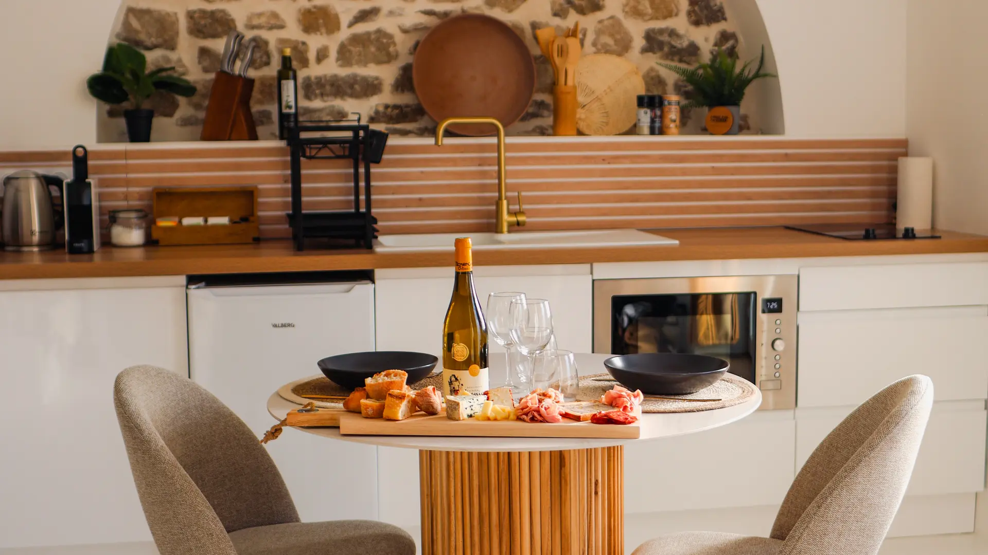 - Une cuisine ouverte équipée d'un frigo/congélateur, d'une plaque à induction, d'un micro-ondes/four, d'un toaster, d'une bouilloire et d'une machine à café Krups