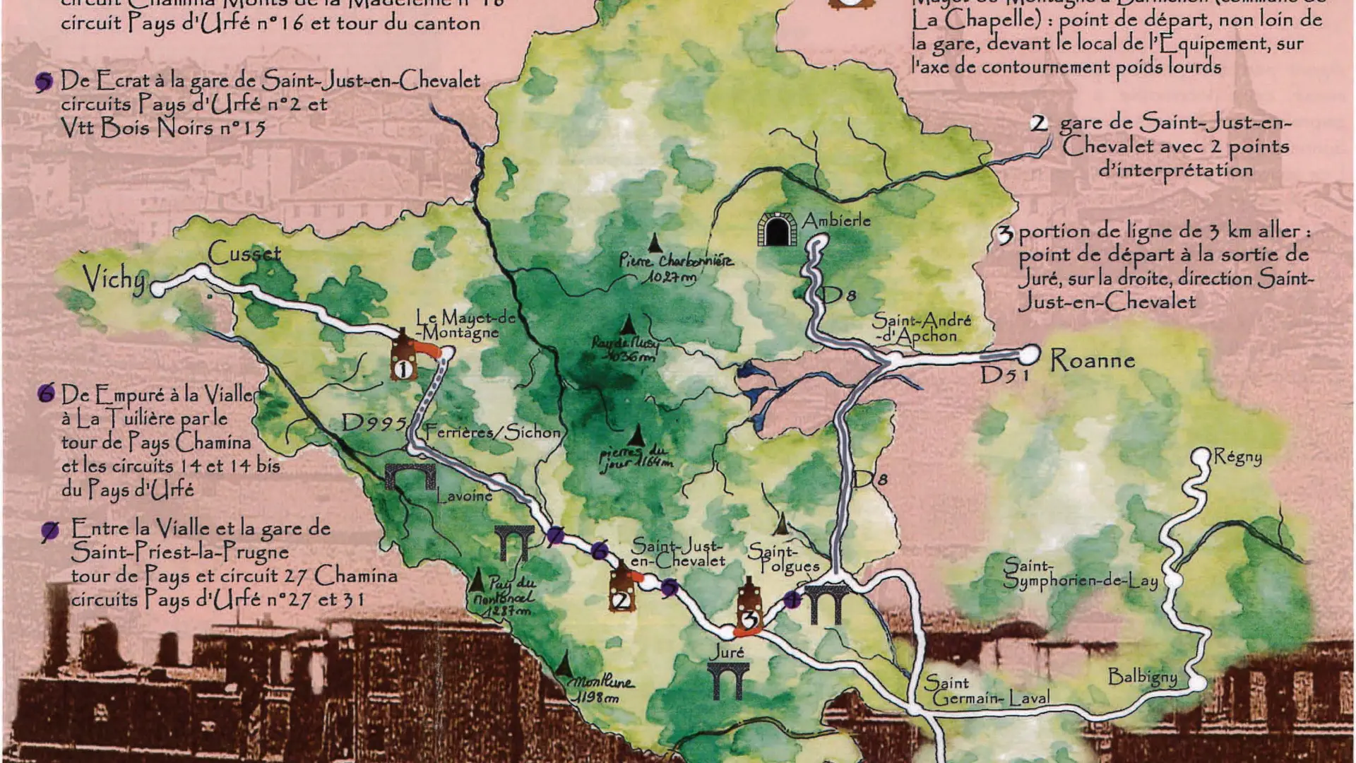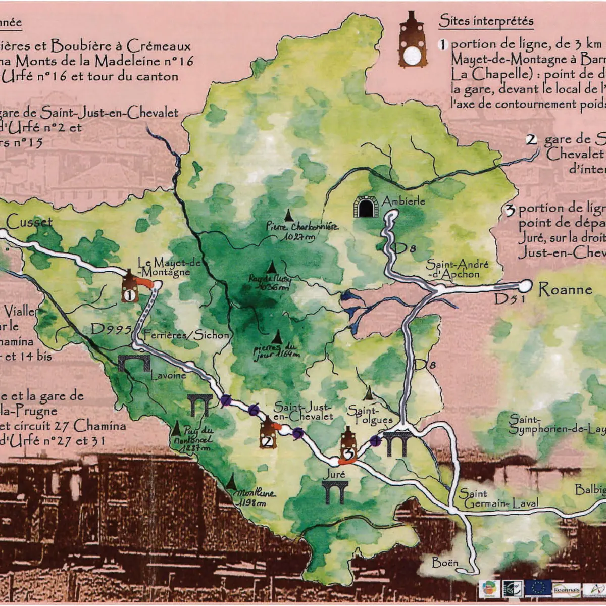Le sentier thématique démarre au bord de la D1, sur la droite à la sortie de Juré en direction de St Just en Chevalet. Le départ est signalé par un grand panneau en métal représentant le profil d'une locomotive. Suivez le sentier et laissez-vous guider le long de ce chemin par les panneaux d'interprétation jusqu'au viaduc. Empruntez le même itinéraire pour le retour.