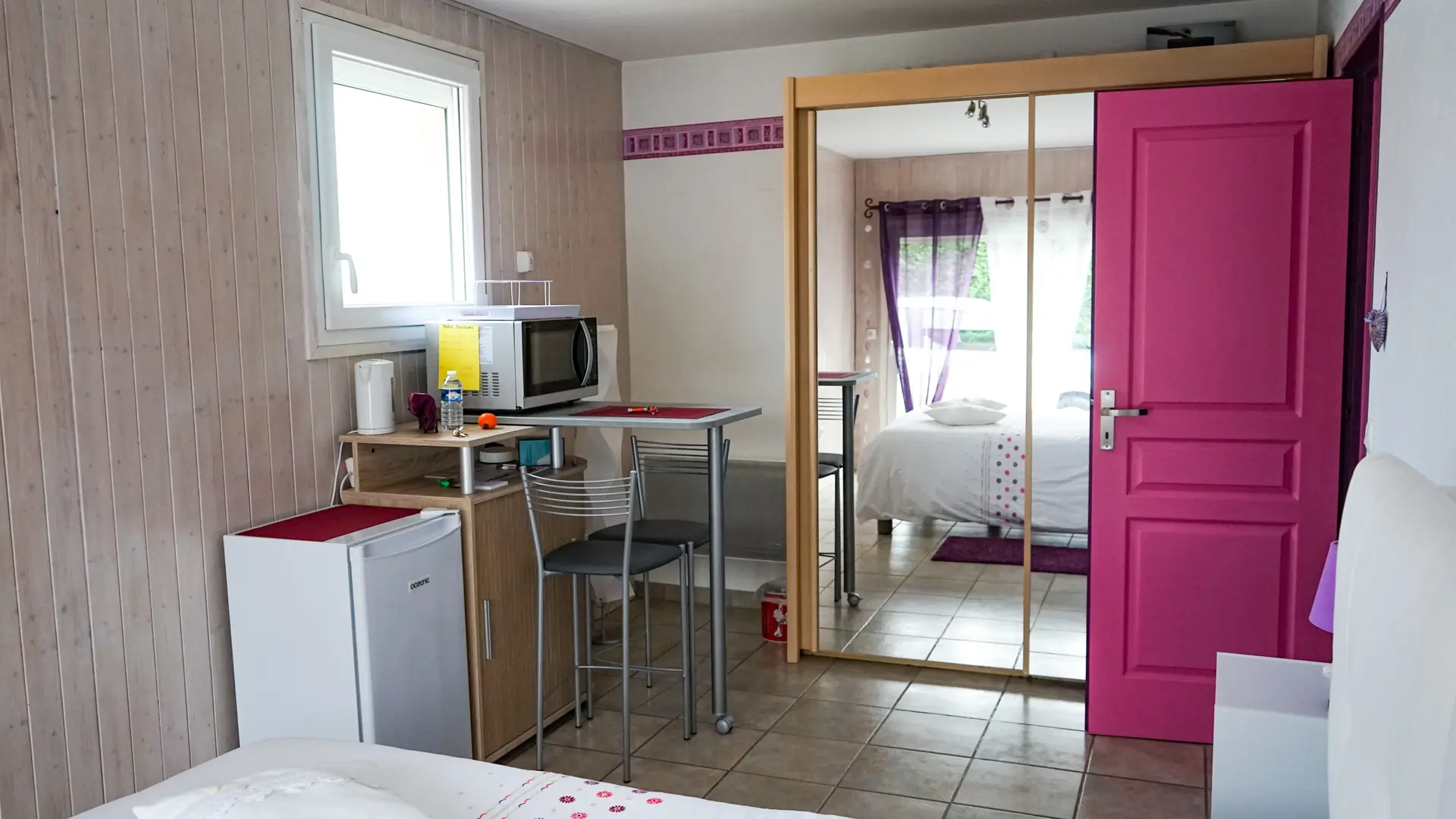 Charmante et spacieuse chambre d'environ 16m² comprenant une table haute avec 2 tabourets ainsi qu'un espace pour ranger verres, tasses & couverts. Vous disposerez aussi d'un micro-onde et d'une bouilloire. Une salle de bain de 6 m2 avec douche, lavabo & wc.