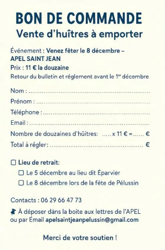 Sur pré commande avant le 1er décembre 2025, bulletin ci-joint à déposer dans la boîte aux lettres de l’APEL ou le retourner par mail