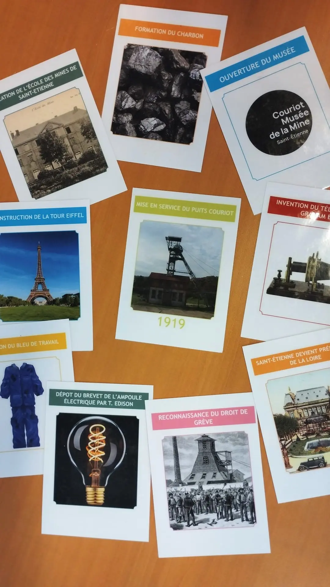 L’invention de la machine à vapeur a t-elle eu lieu avant ou après la création de l’École des mines de Saint-Étienne ? Et l’apparition de la lampe électrique est-elle plus ancienne que la construction du Puits Couriot ? Tout au long de la découverte du site, participez à notre jeu de cartes pour reconstituer la grande frise chronologique du monde de la mine. Pour jouer, pas besoin de connaître Couriot sur le bout des doigts ! Faites appel à votre sens de la déduction... et à votre intuition !