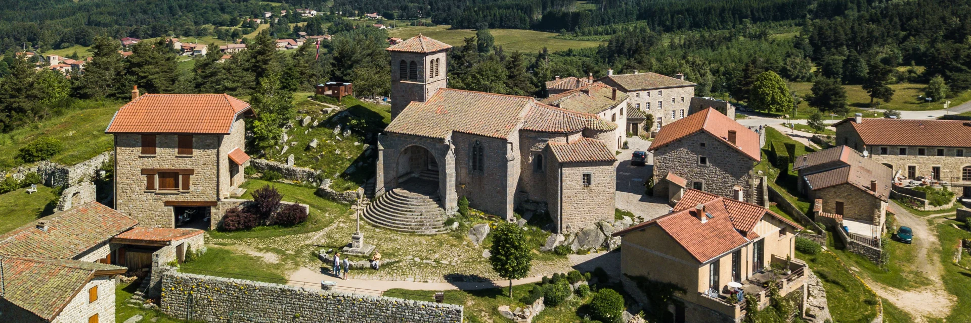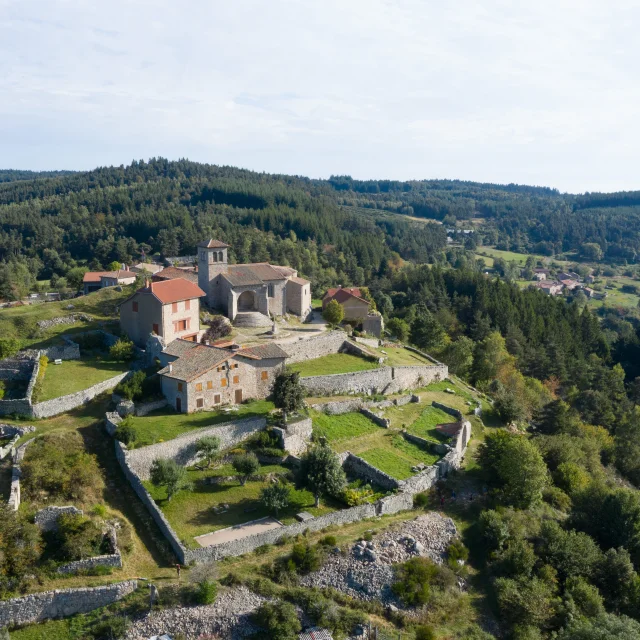 Ils forment un ensemble patrimonial unique. L’église, dont le chœur date du XIIᵉ siècle, conserve son allure romane sobre et harmonieuse. Ses pierres blondes et son clocher trapu dominent le village et semblent dialoguer avec les ruines voisines. Juste derrière, sur un éperon granitique, s’élevaient autrefois les puissantes fortifications du château médiéval. De l’enceinte, on distingue encore une porte fortifiée en arc brisé, ornée d’une archère-canonnière et classée Monument Historique. Le donjon, aujourd’hui disparu, a laissé place à un belvédère offrant un panorama exceptionnel à 360° sur le Forez et le Velay.